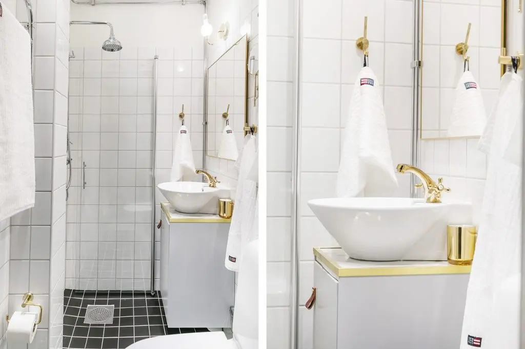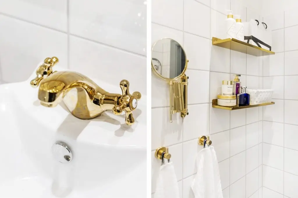 Accesoriile din alama pe care le intalnim in zona de baie, dar si in cea de bucatarie aduc un plus de stil amenajarii in special in spatiul baii unde contrastul alb-negru risca sa fie usor monoton.