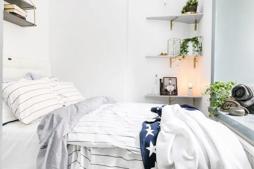 Trecerea inspre dormitor se face direct din living. Spatiul destinat zonei de dormit este mic si ingust, patul fiind piesa principala a acestei incaperi. Etajerele cu decoratiuni si pervazul lat al ferestrei ofera un plus de personalitate spatiului. Zona de depozitare principala este concentrata in zona livingului si holului prin dulapurile inalte montate in acest perimetru.