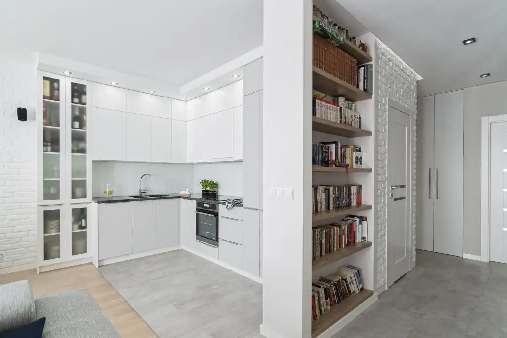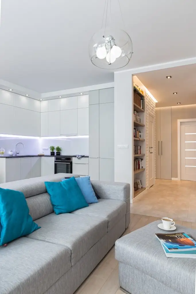 Livingul si bucataria formeaza un tot unitar, delimitate doar la nivelul pardoselii. Amenajarea in sine urmeaza linia designului minimalist, nordic, cu piese de mobilier putine, dar esentiale. Fiecare functiune in parte este bine conturata si individualizata la nivelul spatiului. Astfel, intr-o singura camera, exista 3 zone diferite cu rol bine definit.