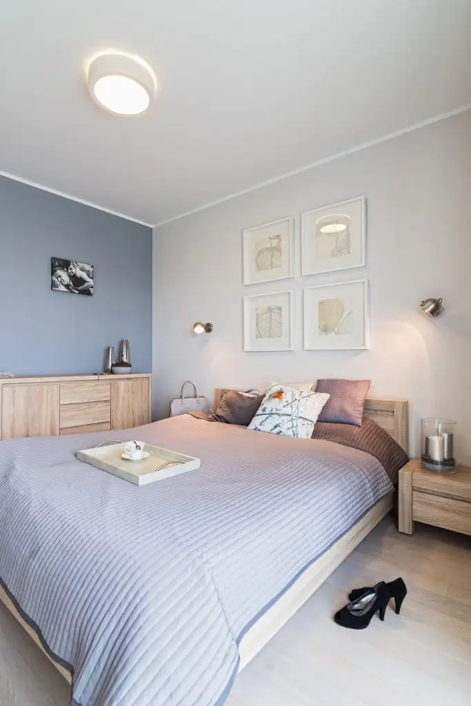 Dormitorul urmeaza aceeasi linie minimalista, cu accente de albastru pe care le intalnim si in living. Piesele de decor imbraca spatiul si ii confera personalitate tablouri sau lampi de iluminat. Cele 2 bai sporesc confortul, una fiind destinata musafirilor.