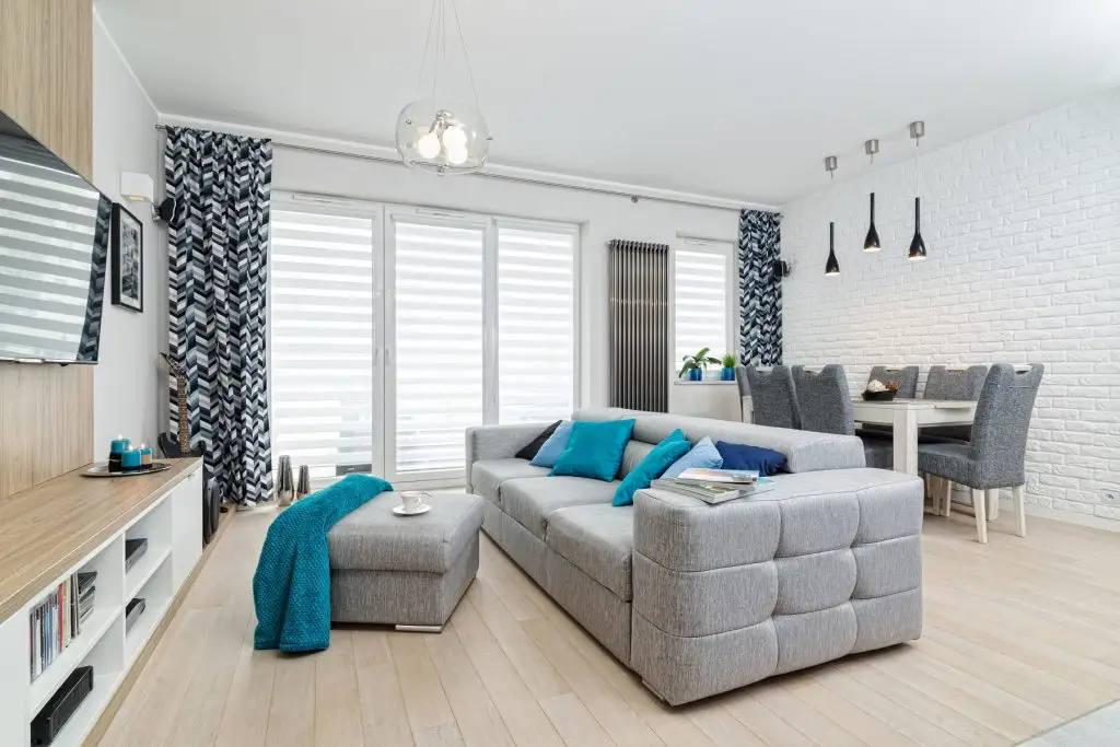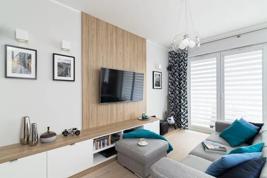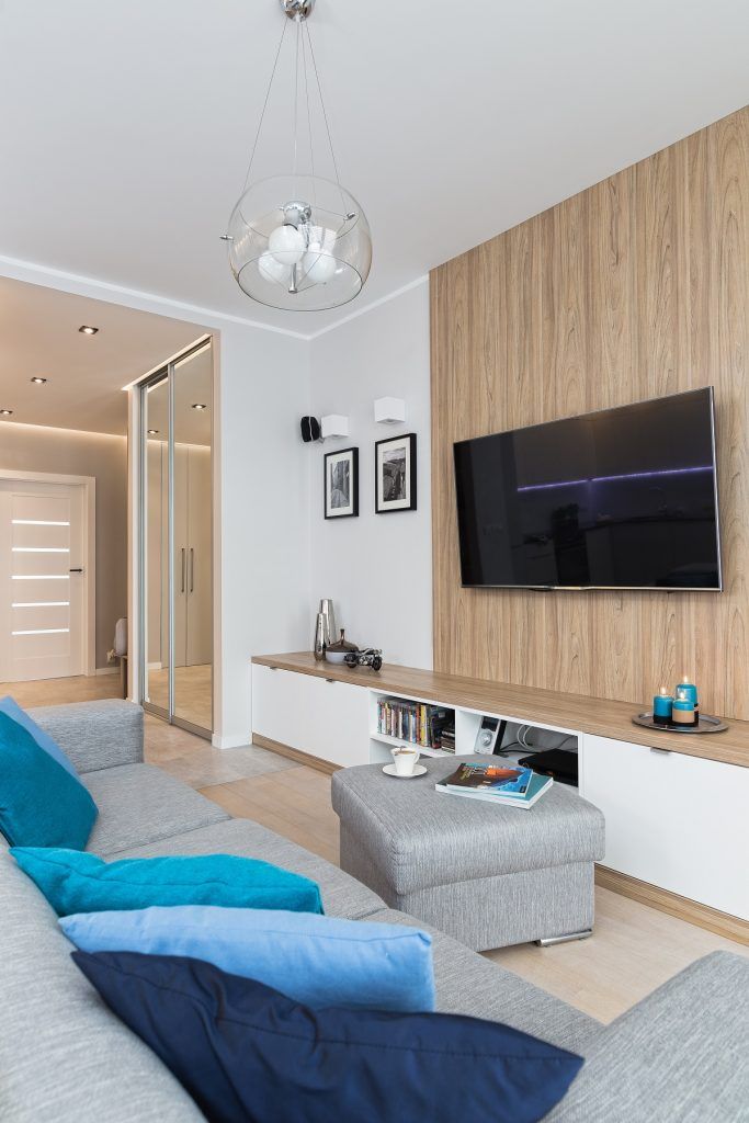 Livingul este compus dintr-o canapea confortabila, un otoman multifunctional, ce poate fi folosit atat ca loc de sezut, cat si ca masuta pentru suport. Zona televizorului este marcata printr-o placare cu laminat, restul spatiului fiind amenajat cu dulapuri de inaltime joasa.