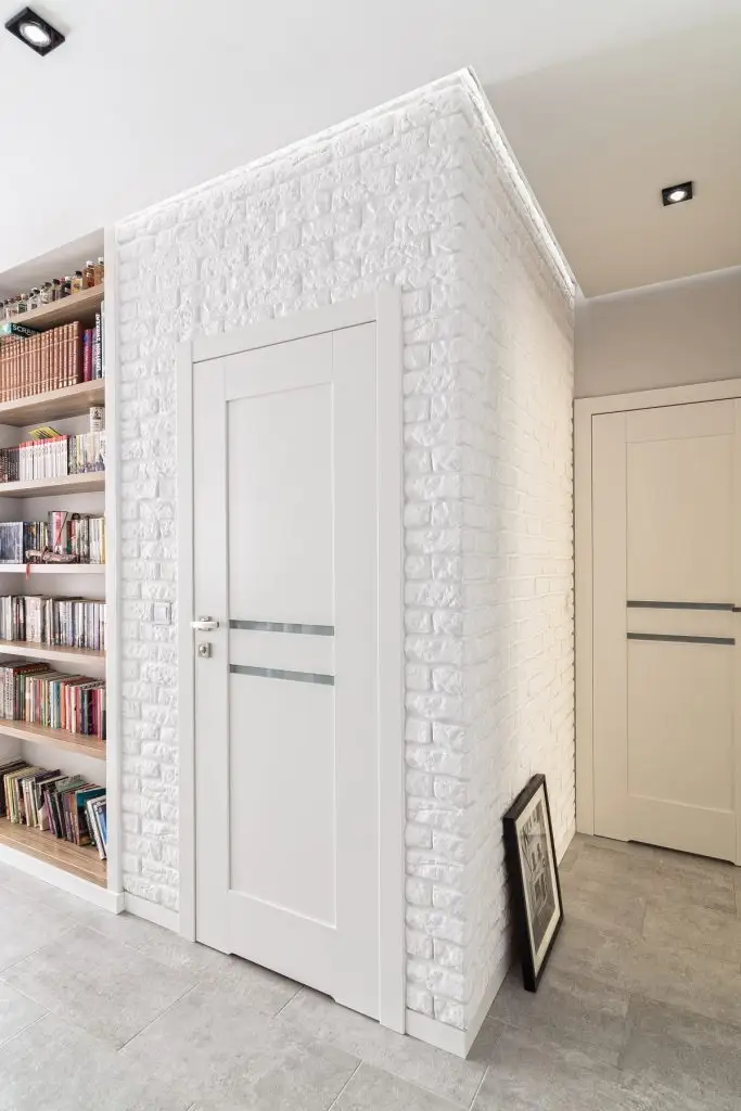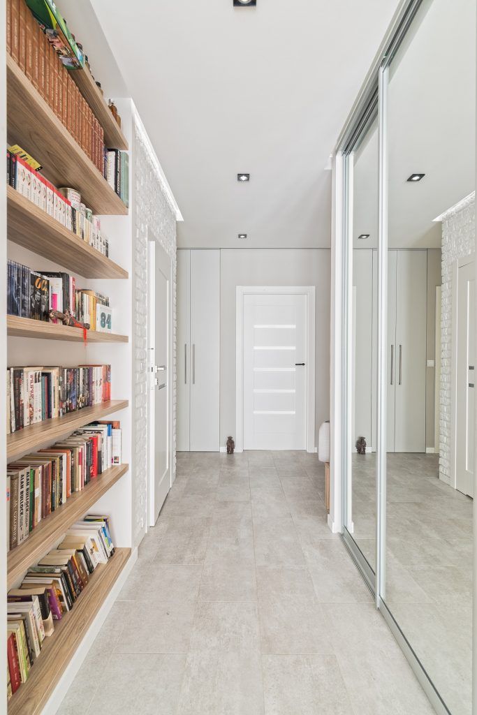 Spuneam ca spatiile comunica armonios intre ele in acest apartament. Astfel, livingul pare a se continua in hol prin amenajarea peretelui cu o biblioteca generoasa, incastrata intr-o nisa creata special pentru a adaposti rafturile pentru carti.