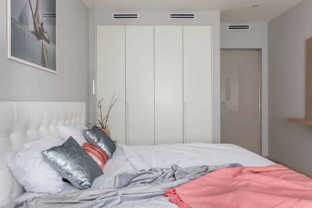 Dormitorul ne propune o abordare usor feminina prin paleta cromatica dezvoltata. Confortul este cuvantul care descrie cel mai bine acest spatiu. Tablia tapitata, cuverturile si texturile bogate iti inspira relaxare si o stare de bine. Zona de make-up aduce un plus de feminitate amenajarii. Pe langa zona de depozitare generoasa creata in hol, vom gasi si in dormitor dulapuri pentru haine incorporate intr-o nisa special creata in acest scop.