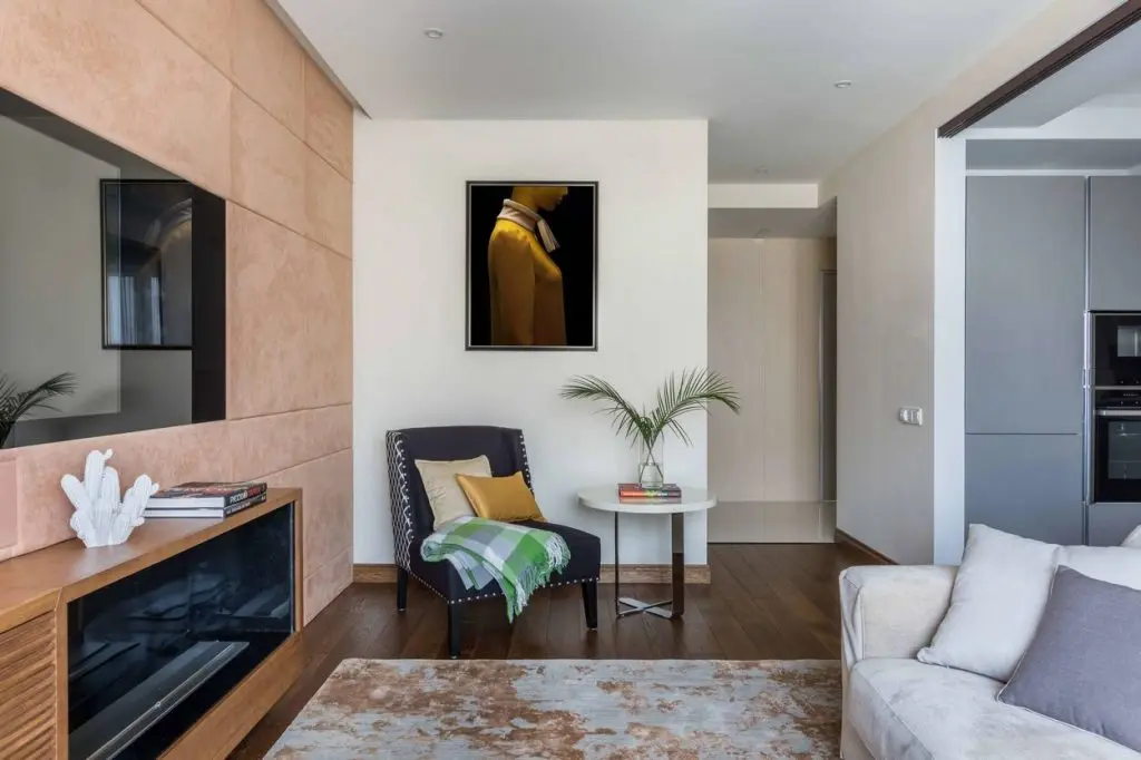 Partea spectaculoasa a acestei amenajari o reprezinta zona de living cu un panou din sticla ce ascunde televizorul. Imediat sub el, a fost integrat si un semineu pe baza de bioetanol, o dorinta a celor doi tineri. Totul este minimal tratat, cu un design simplu, cu suprafete netede si linii drepte.