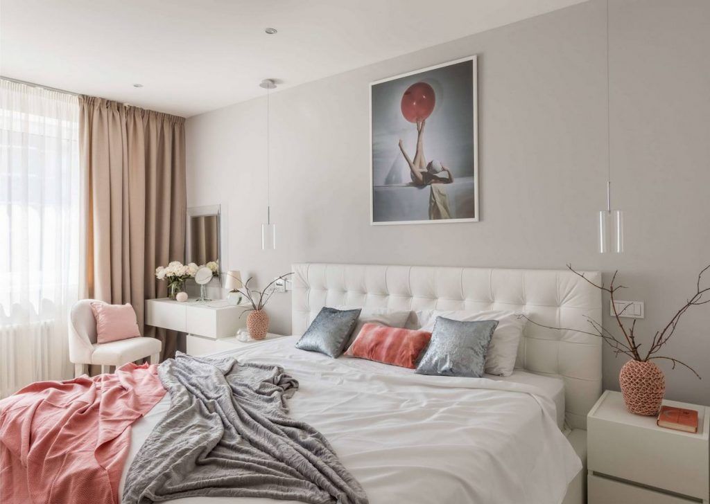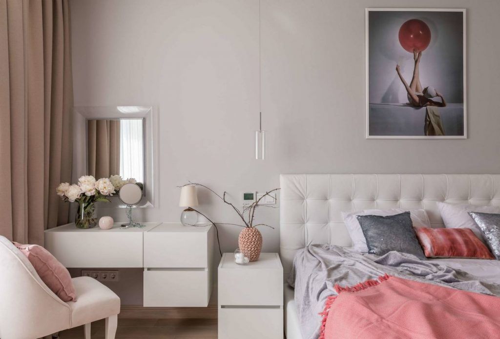 Dormitorul ne propune o abordare usor feminina prin paleta cromatica dezvoltata. Confortul este cuvantul care descrie cel mai bine acest spatiu. Tablia tapitata, cuverturile si texturile bogate iti inspira relaxare si o stare de bine. Zona de make-up aduce un plus de feminitate amenajarii. Pe langa zona de depozitare generoasa creata in hol, vom gasi si in dormitor dulapuri pentru haine incorporate intr-o nisa special creata in acest scop.