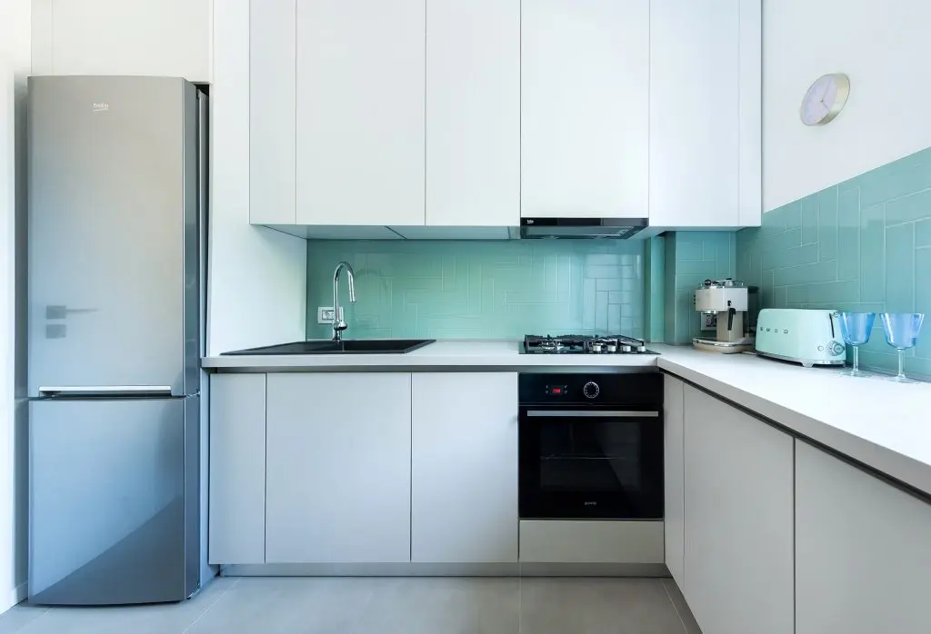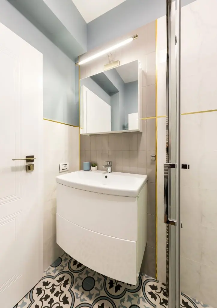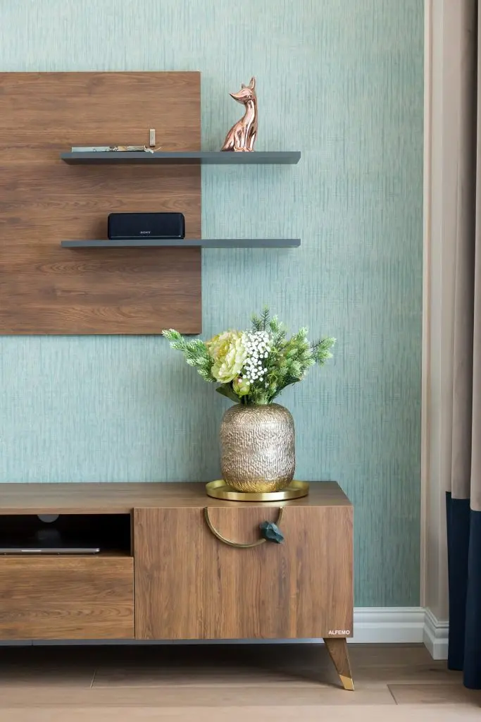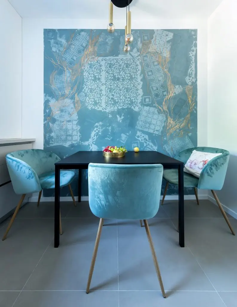 Un alt element cheie al amenjarii este peretele din zona de luat masa, pentru care a fost descoperita si folosita vopseaua decorativa Calcecruda de la Nococolor, pictata mai apoi cu foita de aur. Nuanta de albastru deschis creeaza fundalul perfect pentru mobilierul minimalist al bucatariei. Regasim tonuri de albastru la placutele ceramice dintre corpurile suspendate si blatul de lucru si la catifeaua scaunelor.