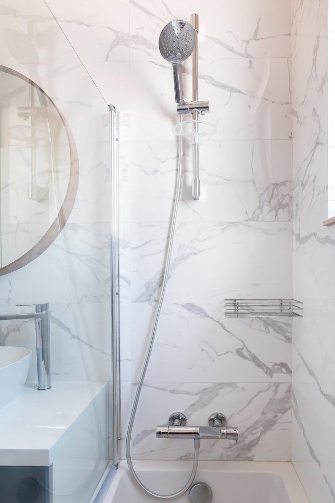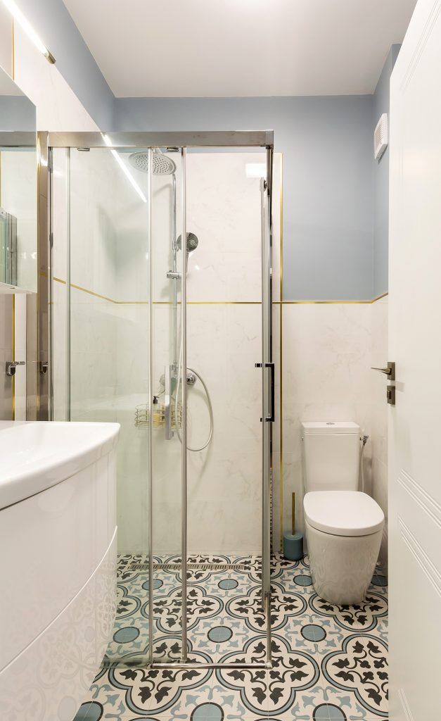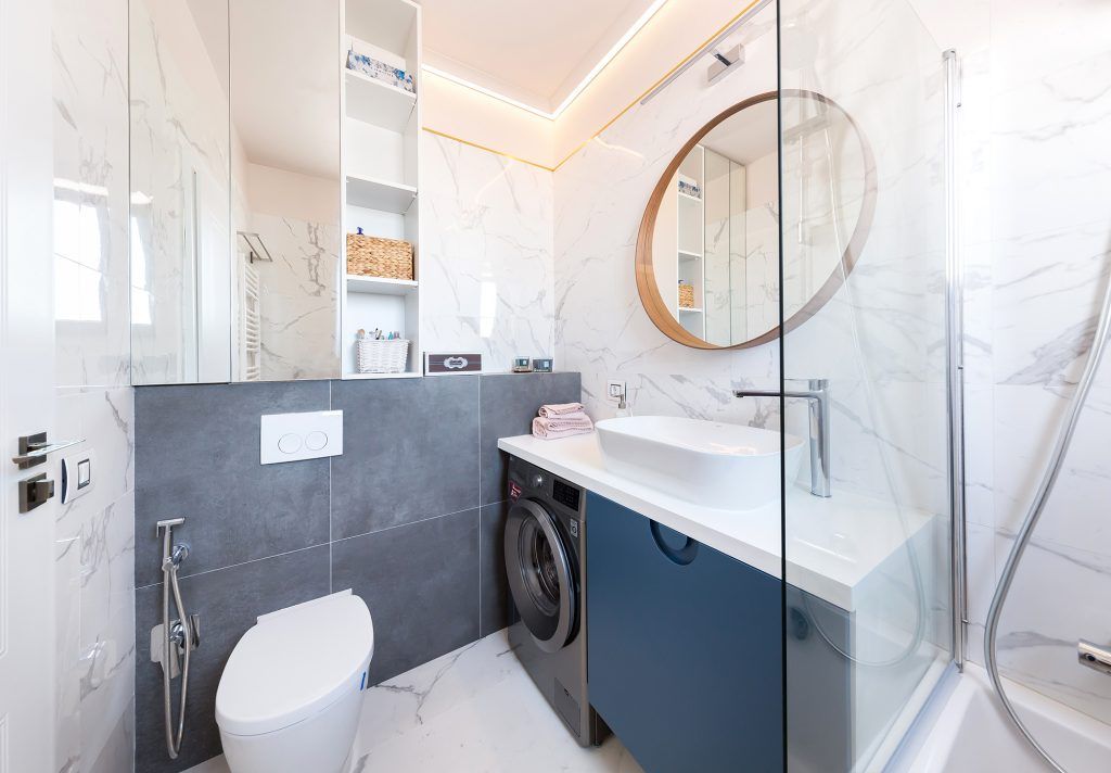 Un alt element cheie al amenjarii este peretele din zona de luat masa, pentru care a fost descoperita si folosita vopseaua decorativa Calcecruda de la Nococolor, pictata mai apoi cu foita de aur. Nuanta de albastru deschis creeaza fundalul perfect pentru mobilierul minimalist al bucatariei. Regasim tonuri de albastru la placutele ceramice dintre corpurile suspendate si blatul de lucru si la catifeaua scaunelor.