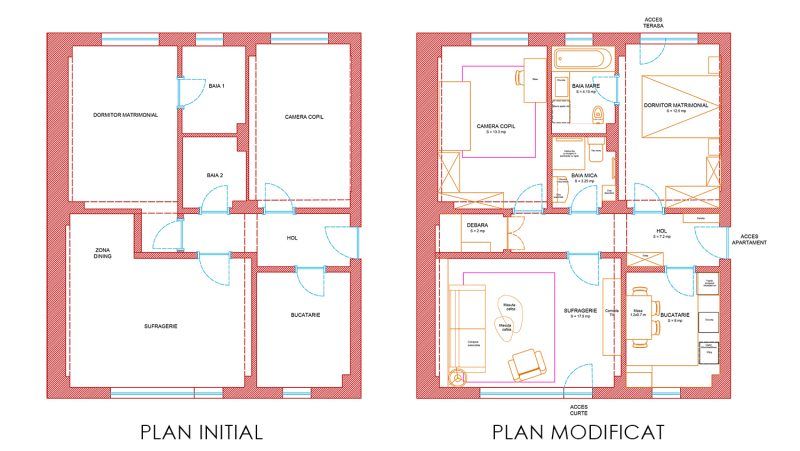 La nivel de compartimentare au fost realizate modificari minime dar extrem de utile pentru utilizarea eficienta a camerelor. Astfel, a fost creata o zona de depozitare cu acces din hol, in locul nisei din living, destinate initial diningului (care a fost integrat in bucatarie). Totodata, din primul dormitor s-a realizat un acces catre terasa, astfe ca a fost inversata destinatia camerelor, camera copilului devenind dormitorul matrimonial. Aceasta schimbare a condus la mutarea accesului in baia matrimoniala, din dormitor.