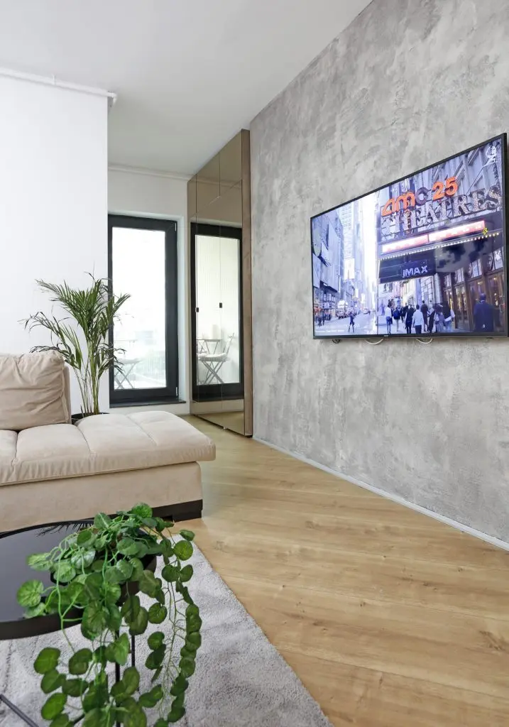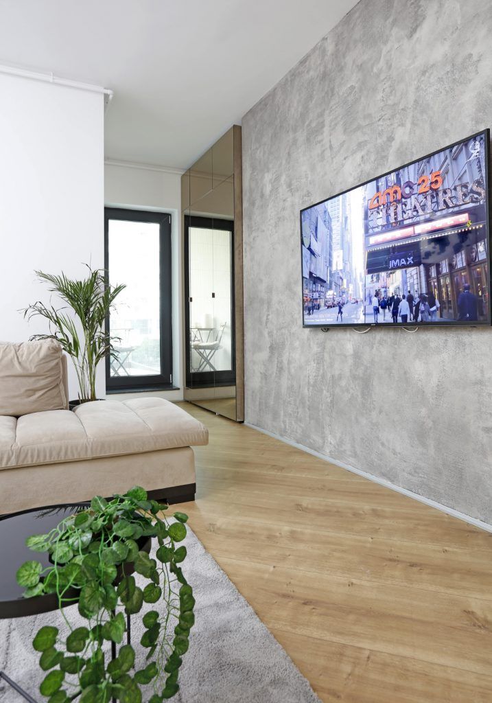 In dreptul usii de sticla dinspre balcon regasim o depozitare cu usi din oglinda aurie, oglinda ce reflecta lumina naturala, un mare avantaj pentru zona de living.