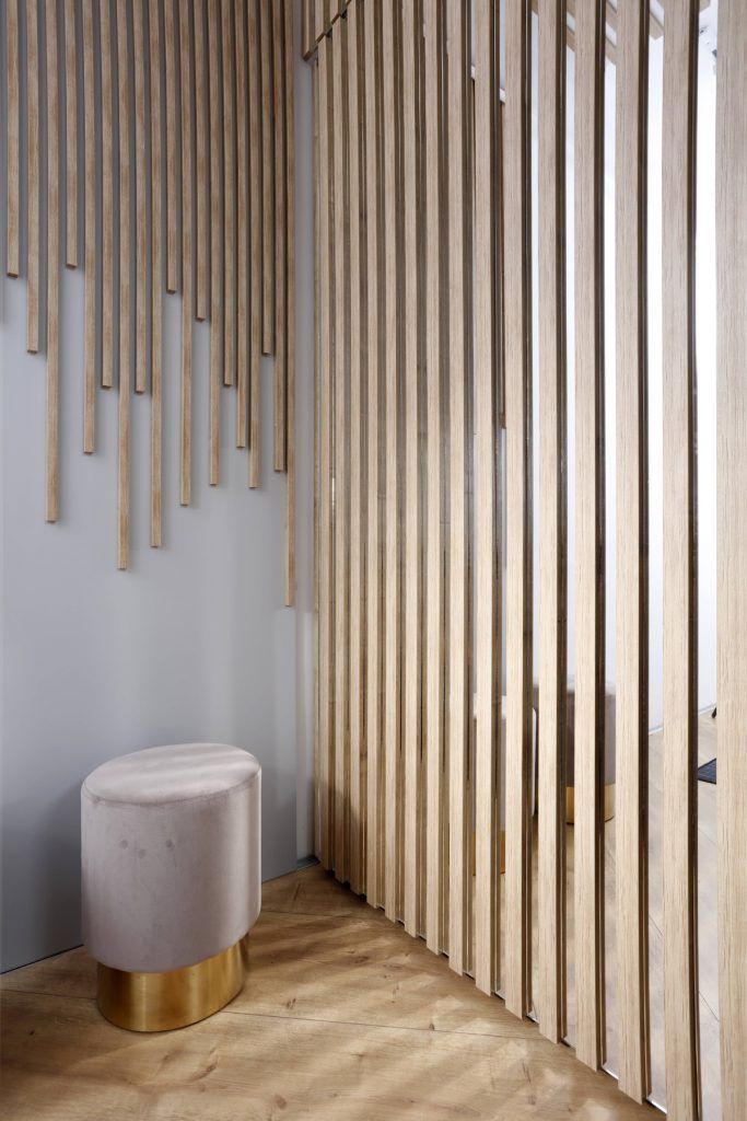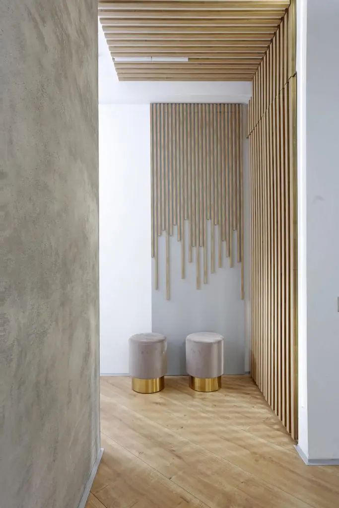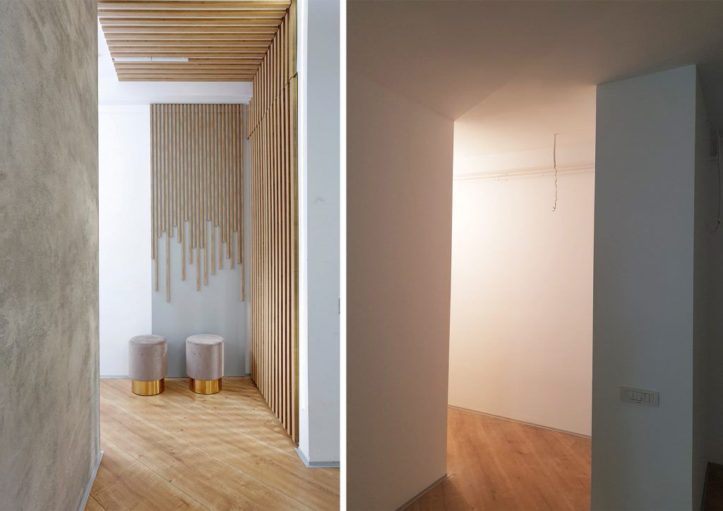 “In capatul holului regasim un dressing realizat pe comanda, cu usi ce combina o serie de sipci de lemn cu oglinda intre ele. Astfel, fasiile de oglinda ofera niste reflexii interesante ale luminii. Gestul a fost dus mai departe, iar sipcile au fost continuate atat pe tavan cat si pe peretele adiacent.“