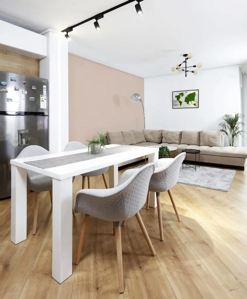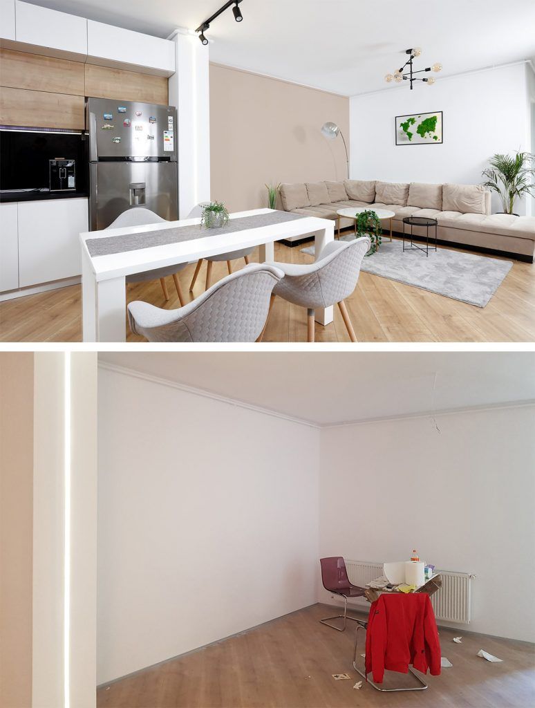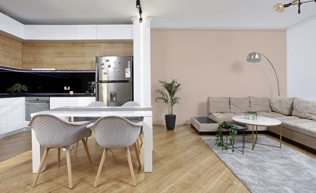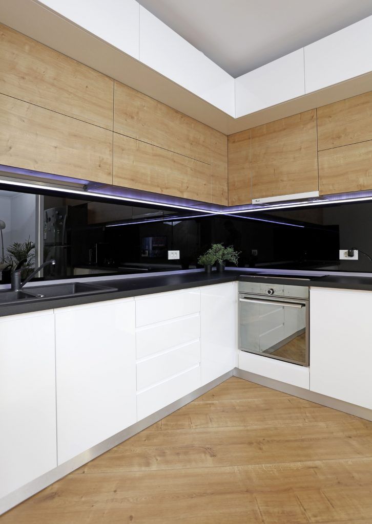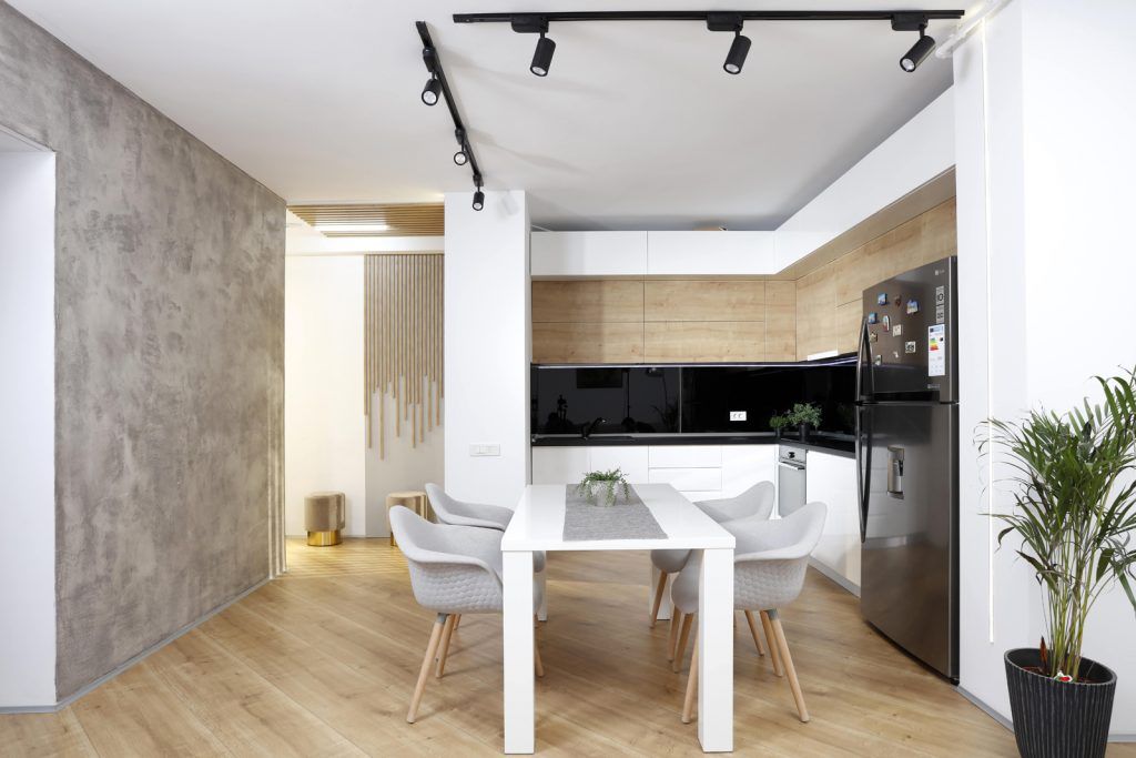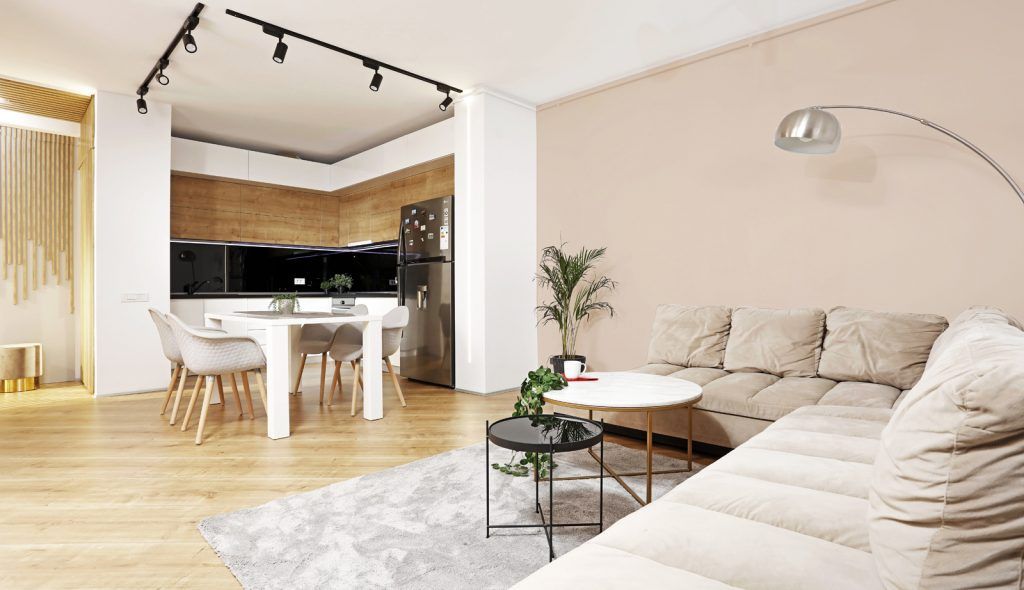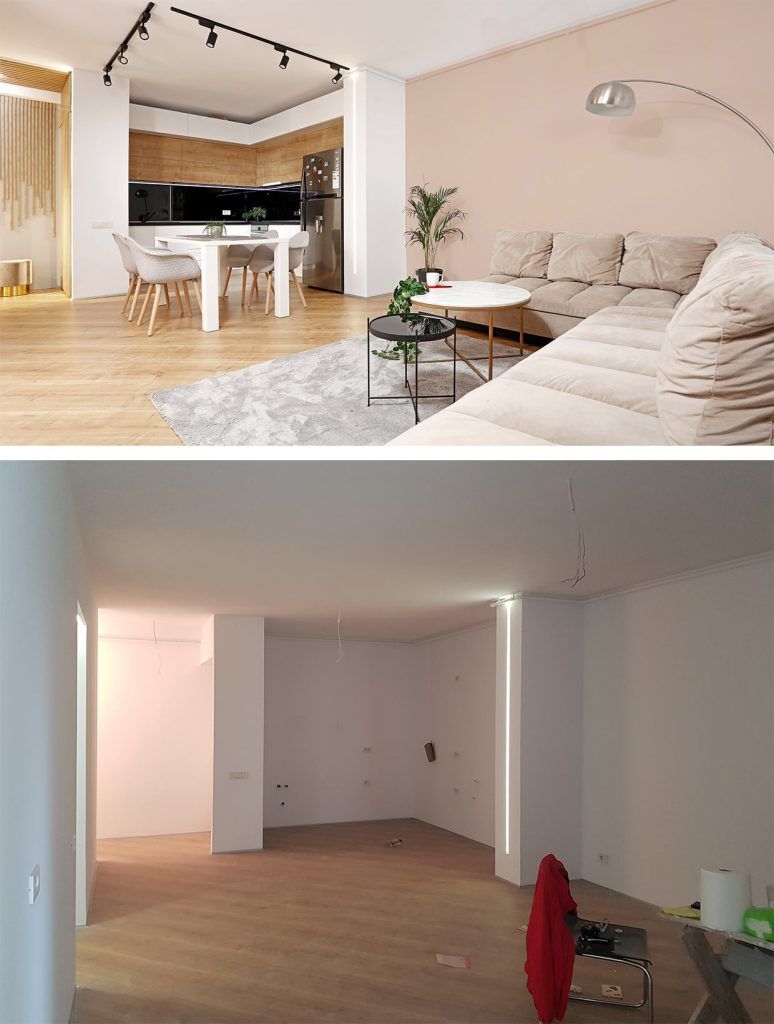 Livingul cu un design modern, minimalist include si bucataria open-space. Regasim aici nuante de alb, negru si accente de textura de lemn. Sticla colorata, folosita pentru splashbackul bucatariei este pusa in valoare de blatul din lemn marca Egger.