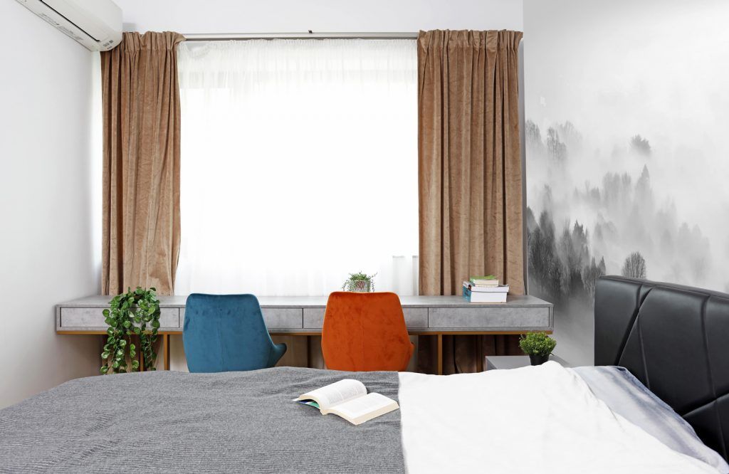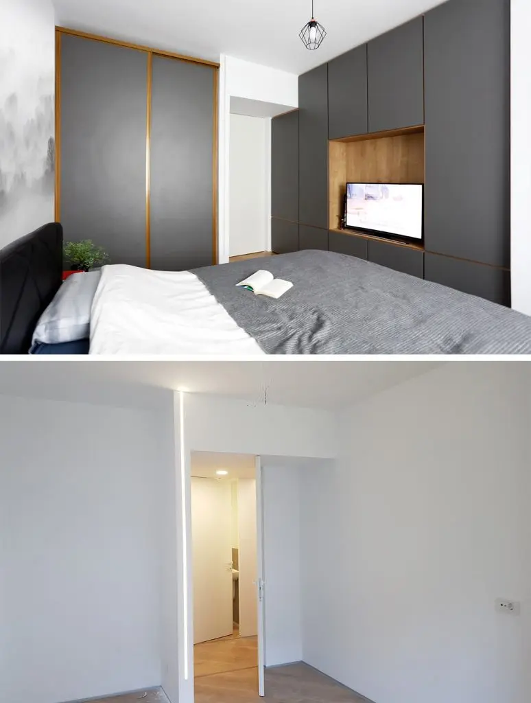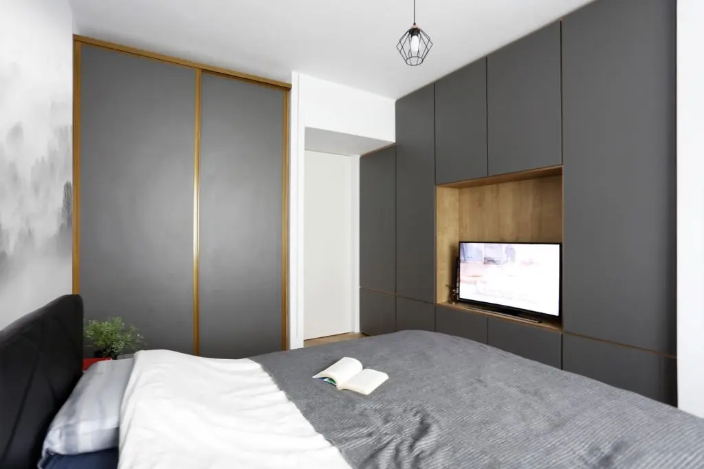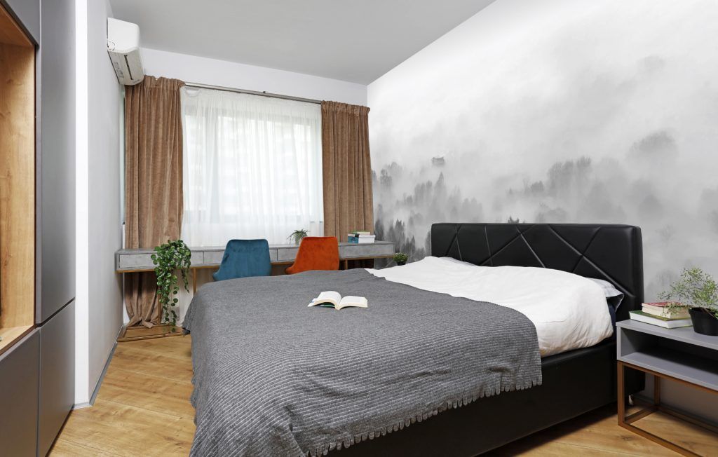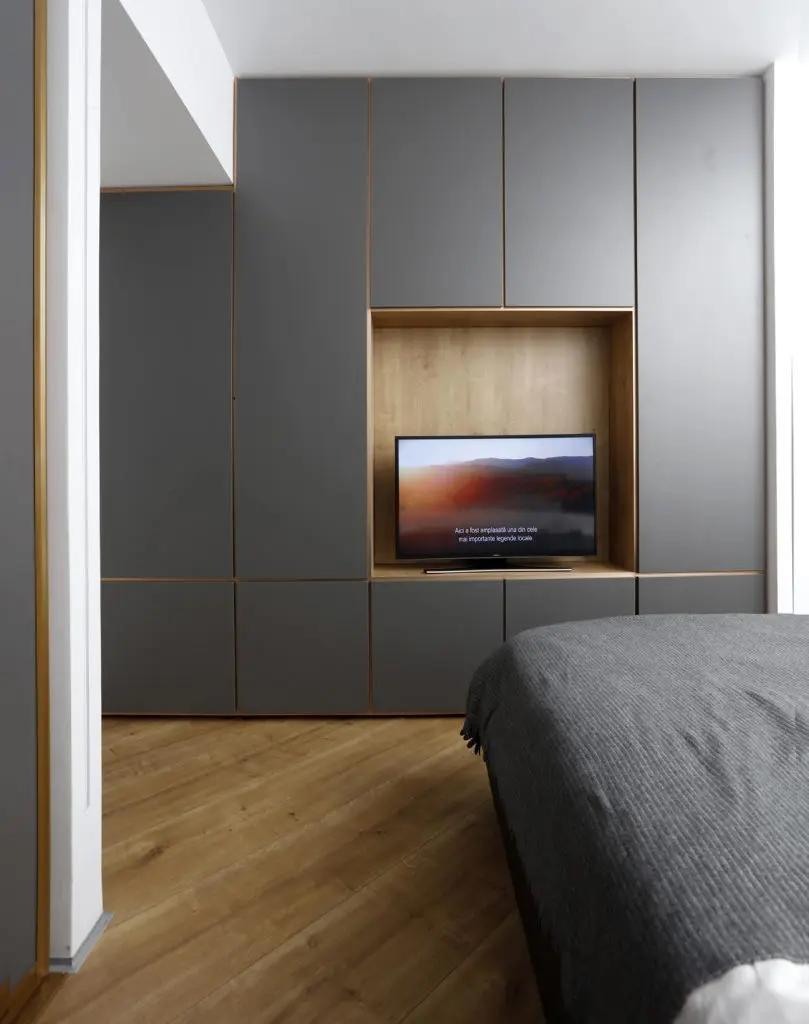 Televizorul din dormitor a fost ingenios incadrat intr-un dressing. Pentru cel de-al doilea dressing au optat pentru usi glisante, eficientizand astfel spatiul disponibil intre pat si mobilier. Tapetul din spatele patului este produs de Rebel Walls. Masa amplasata la fereastra are dublul rol: de birou si masuta pentru machiaj.