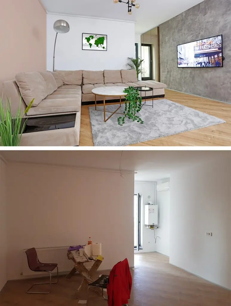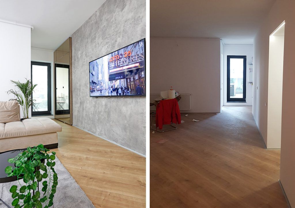 Livingul a fost amenajat tinand cont de cromatica si stilul canapelei de tip coltar pe care beneficiarii au pastrat-o din vechea locuinta. Peretele T V a fost tratat cu vopsea decorativa cu efect de beton aparent.