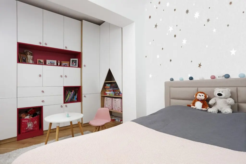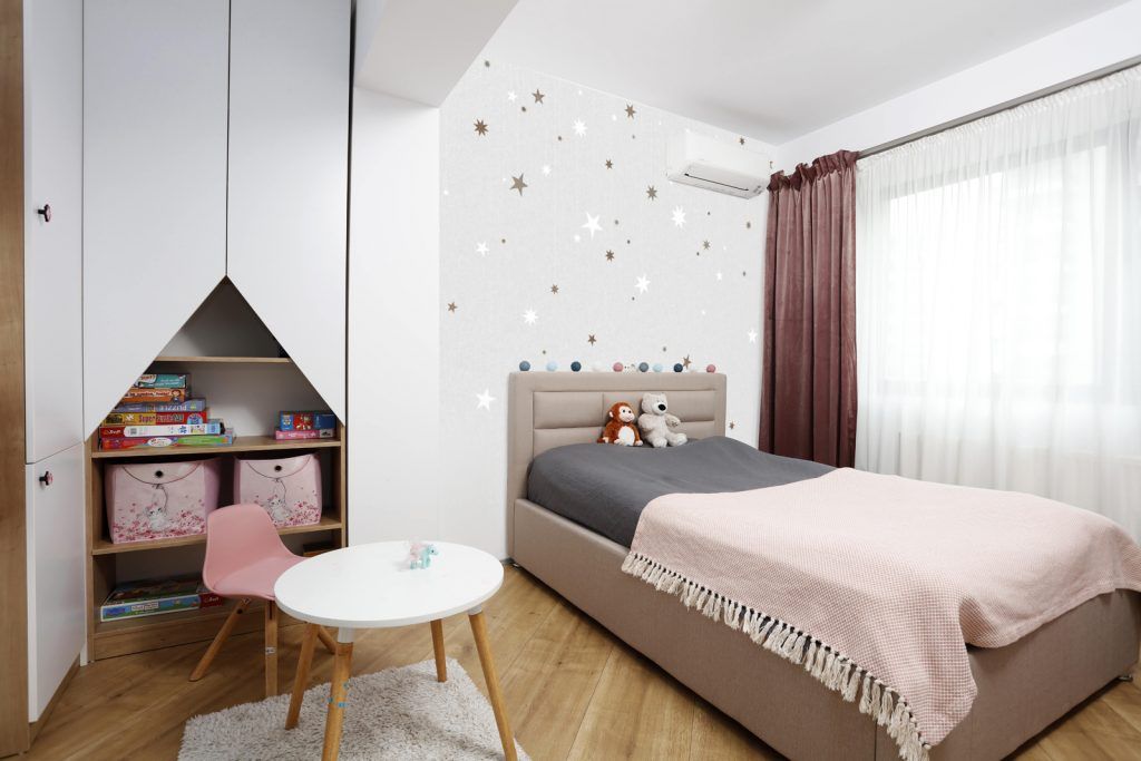 In dormitorul copilului, amenajat cu multa culoare, a fost propus un tapet de la The Home. Dressingul este momentan suficient de incapator pentru jucarii, insa este proiectat pentru a se putea adapta cerintelor in schimbare ale fetitei.