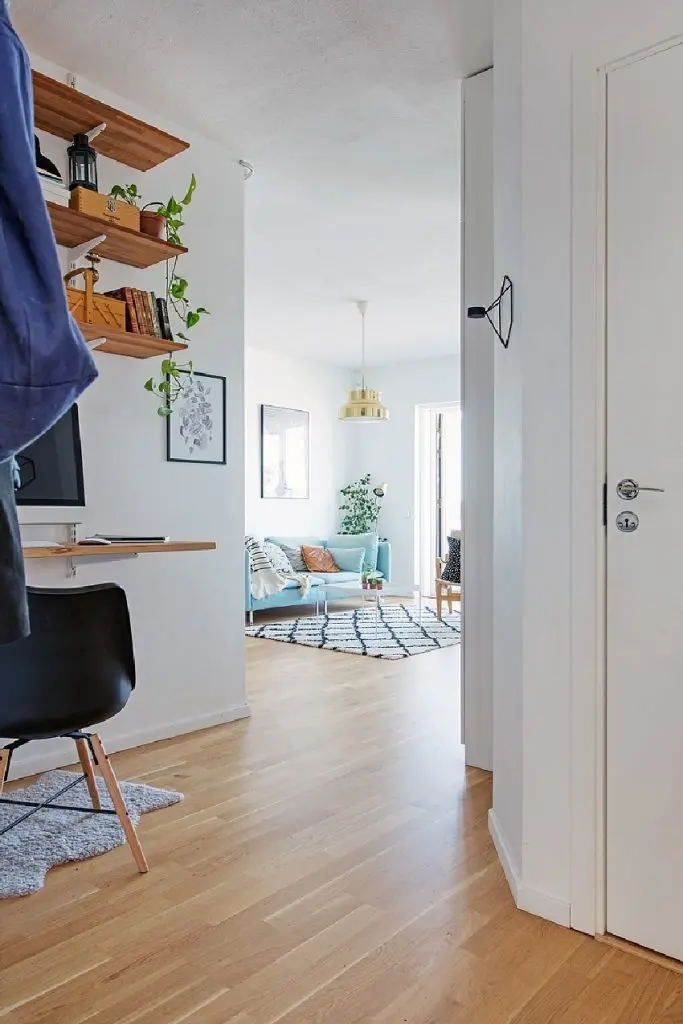 Intregul apartamentul este legat cumva vizual de parchetul simplu care ruleaza pe intreaga suprafata a proprietatii. La intrare se afla un hol nteractiv in care a fost integrat si un mic spatiu ce adaposteste un birou si multiple solutii de depozitare inteligent plasate deasupra usii de la intrare.