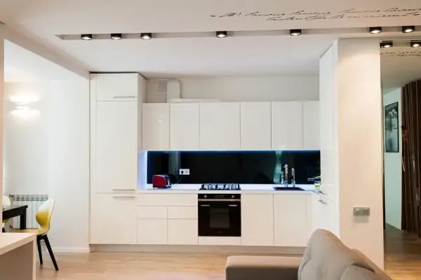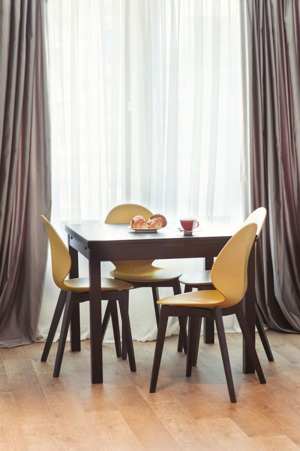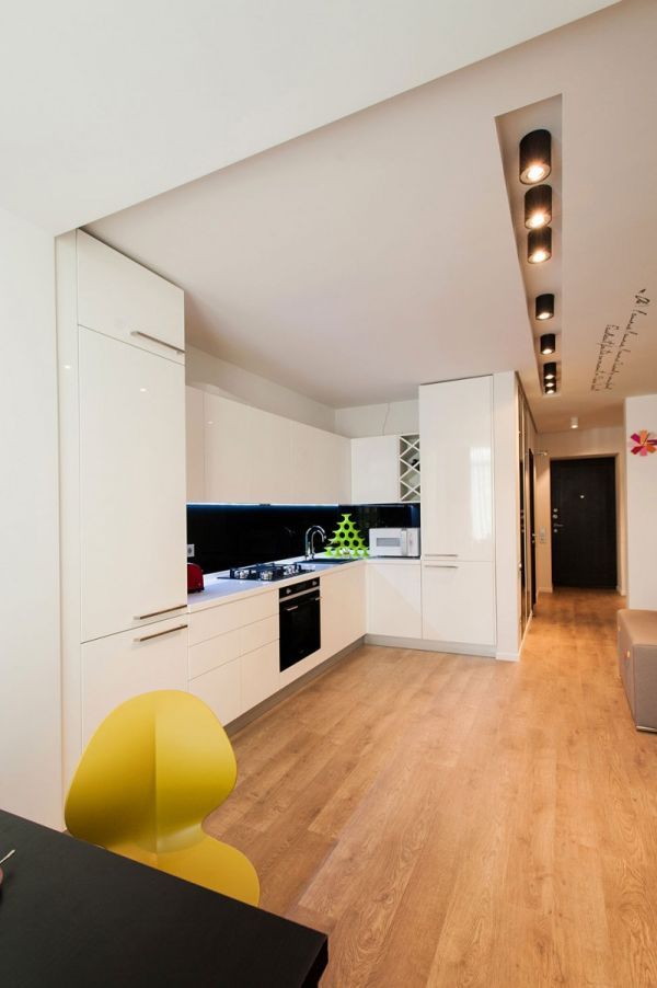 Mobila din bucatarie alba cu frontul dintre corpurile bucatariei este negru oferind un contrast elegant si plin de profunzime in ansamblul amenajarii, continuandu-se ulterior cu masa de dining. Scaunele colorate cu galben aduc si ele un plus de culoare in decor, contrastand placut cu mahonul mesei.