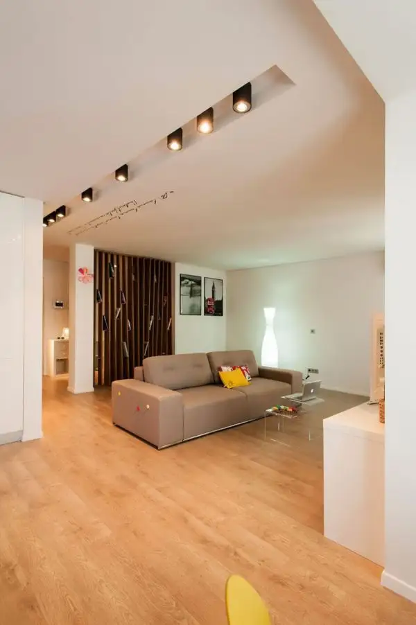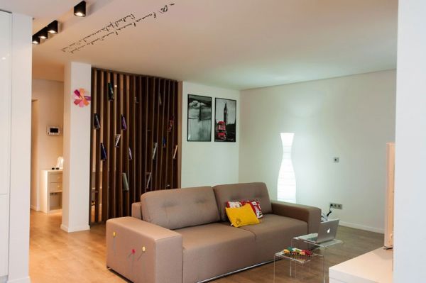Pentru living, s-a preferat alegerea unei canapele si a unei lampi, restul spatiului fiind lasat intentionat liber, fara a mai introduce alte piese de mobilier, cum ar fi dulapuri sau rafturi. De altfel, peretele despartitor dintre camera si hol este format din scanduri de lemn cu mici legaturi intre ele pe care se sprijina diferite carti.
