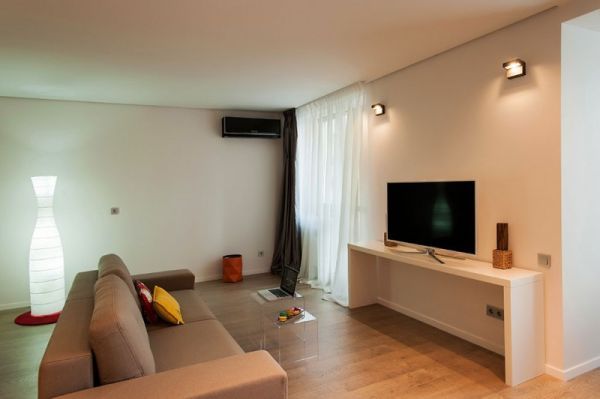 Intregul aspect pare aerisit gratie combinatiei dintre alb si lemn. Piesele transparente precum masuta de cafea si suportul pentru televizor ocupa foarte putin spatiu, oferind camerei plusul de spatiu atat de necesar.
