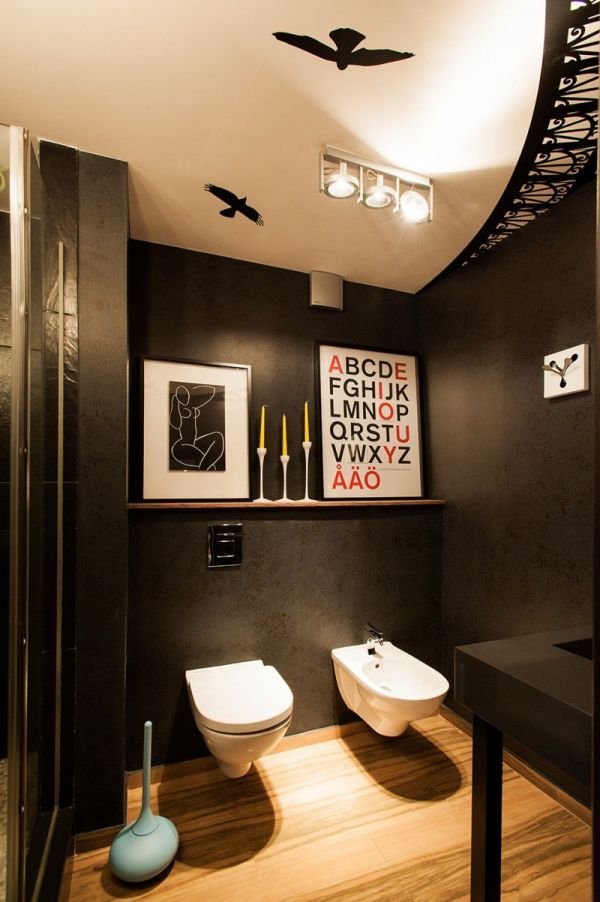 Baia decorata in culori inchise este o piesa de rezistenta in amenajare. Desi ar putea parea mult prea inchisa, culorile alese si petele de alb si crem deschid atmosfera si ii confera o subtila eleganta.