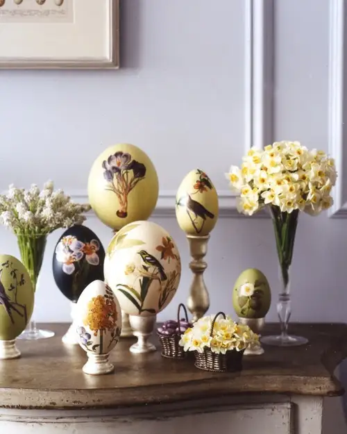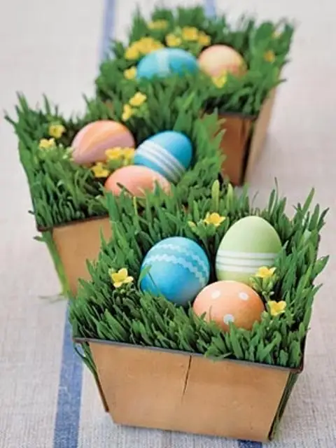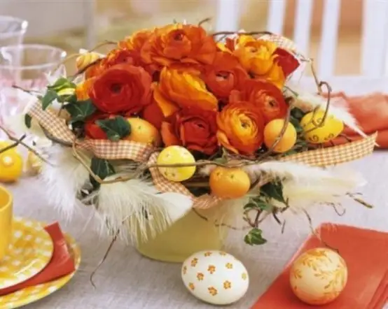 O alta idee este sa creati un aranjament cu flori si oua vopsite pe care sa il asezati pe masa in zilele de Paste. Puisorii pufosi, galbeni pot completa acest tablou simpatic. Fiti creativi si utilizati recipiente de orice fel, bol, vaza, ghiveci, o stropitoare (pentru un aranjament mai complex).