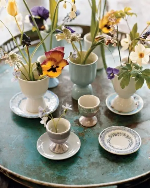 Puteti opta pentru un suport original creat dintr-o ceasca sau ceainic pe care nu il mai folositi in bucatarie. Cu cat mai colorat cu atat mai bine. Nu uitati de iepurasi; desi un simbol occidental, pentru un aranjament delicat de Paste va fi o optiune potrivita.