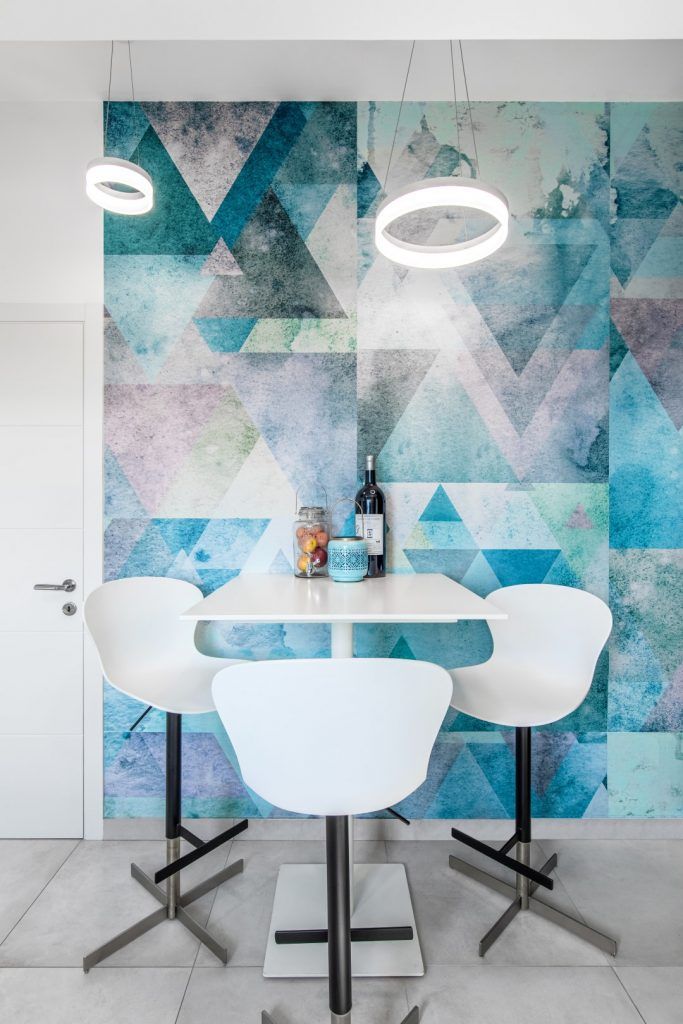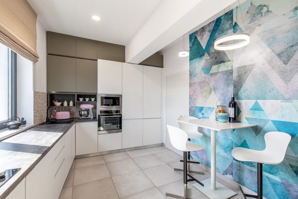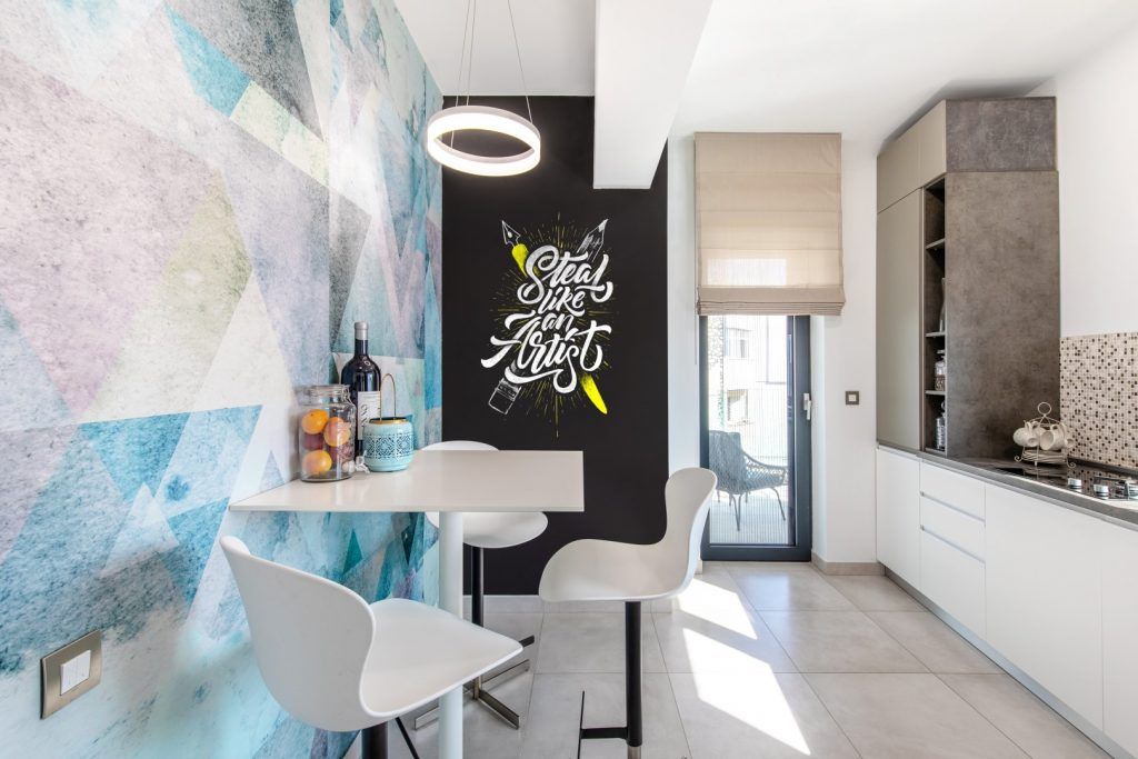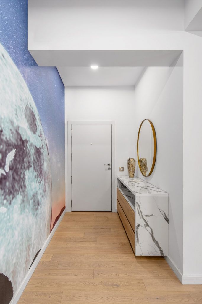 Proiectul „București, Lună Plină” este un apartament de 88 mp amenajat de Interiology Design Studio unde „Luna Plină”, peretele tapetat din holul intrării, este vedeta amenajării, fiind o piesă custom-made care se potrivește perfect cu design-ul apartamentului.