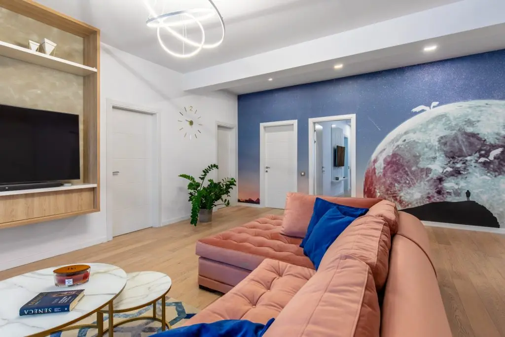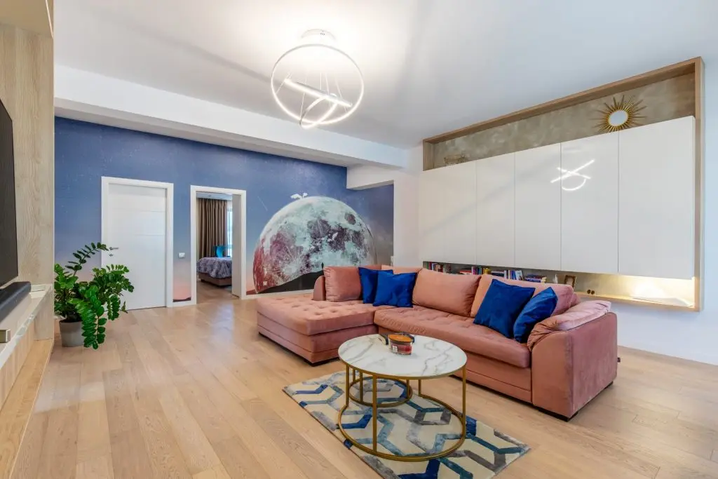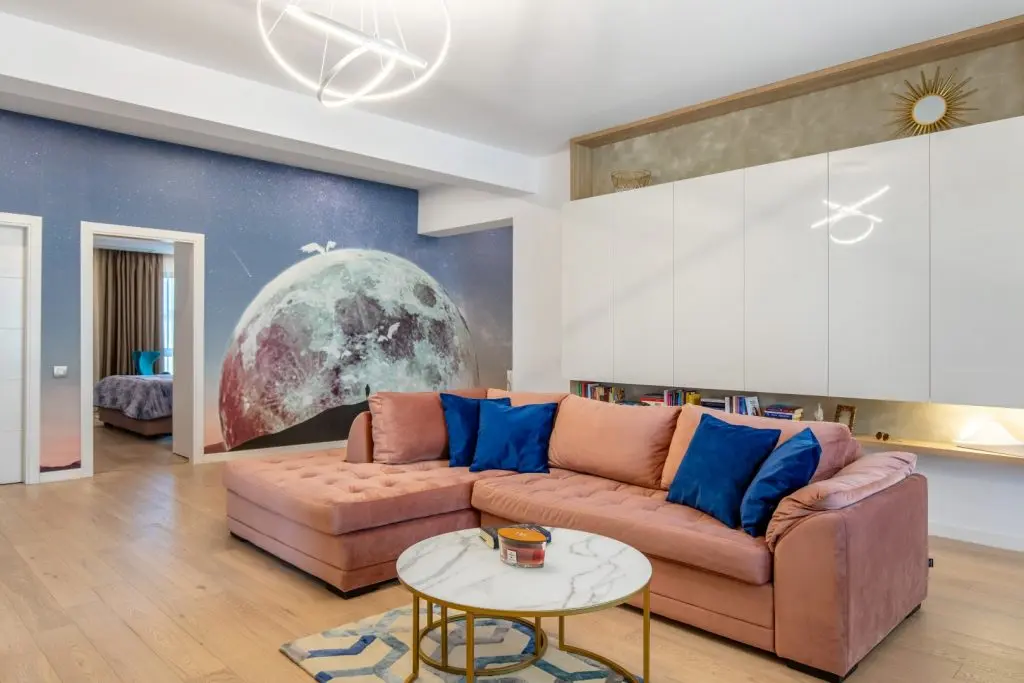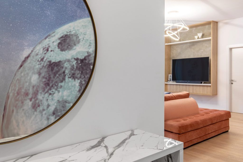 Proiectul „București, Lună Plină” este într-adevăr o mică operă de artă contemporană, ce pornește de la tapetul de la intrare care evocă misterioasa lună în toată splendoarea ei. Pornind de la acest element inedit, s-a conturat un concept modern, în tonuri neutre,cu accente de albastru regal și roz pudrat.