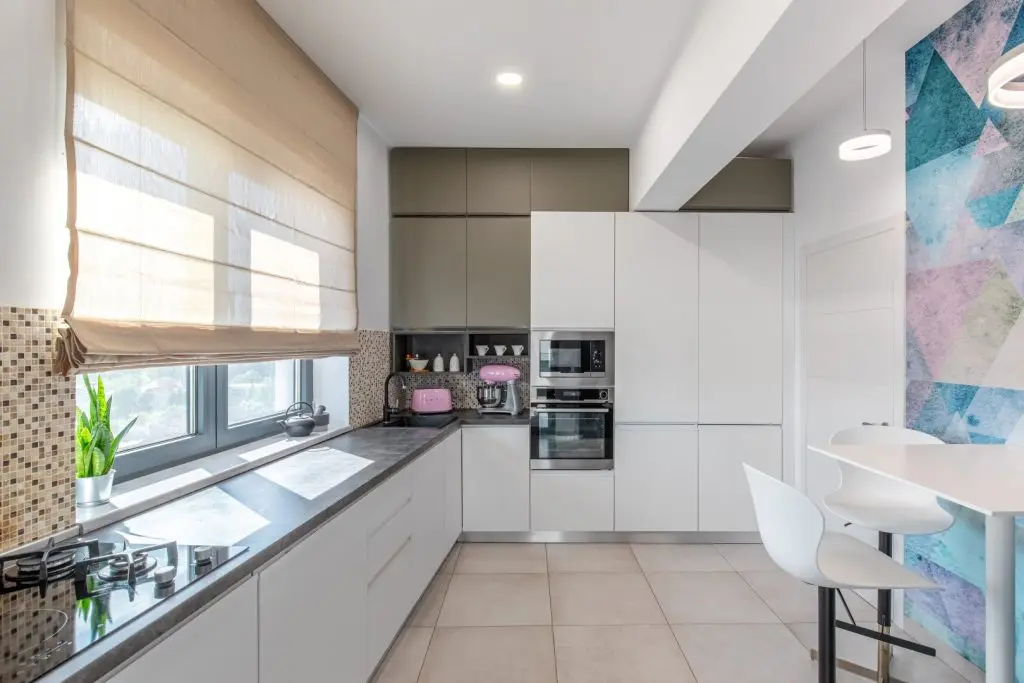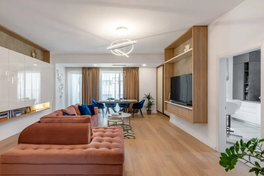 Ele se repetă și în alte încăperi, precum dormitorul matrimonial și bucătăria, pentru un aspect omogen al amenajării apartamentului.
