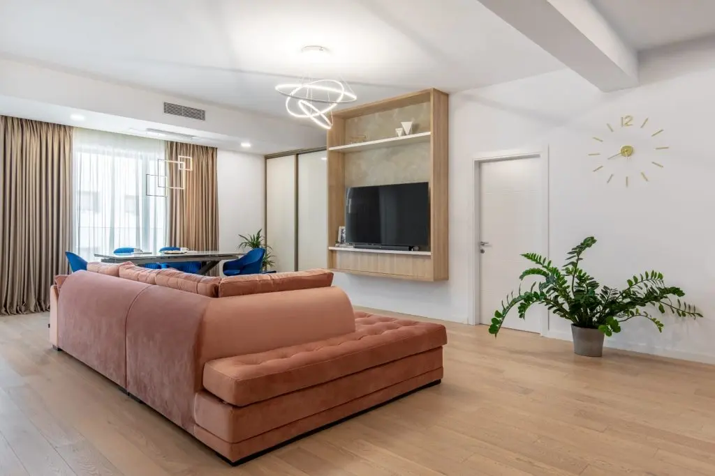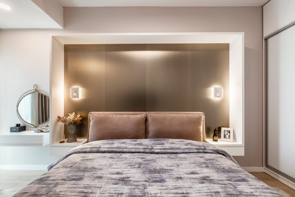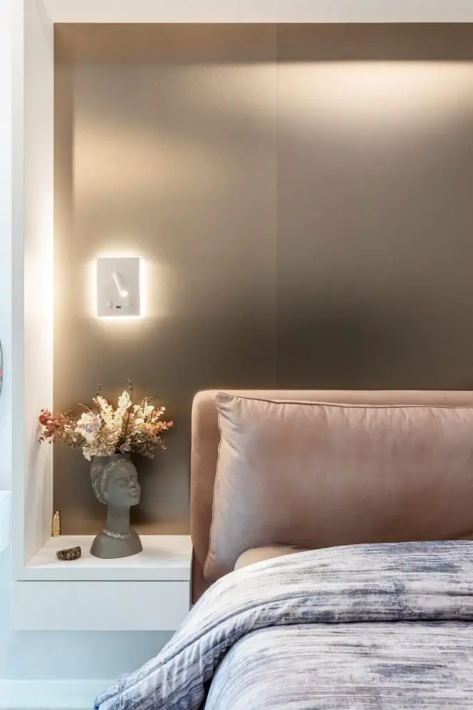 Casetele de mobilier sunt gândite pentru a se încadra în designul fiecărei încăperi în parte. În living acestea au un fundal finisat cu vopsea decorativă cu aspect de beton iar în dormitorfundalul este finisat cu M DF cu aspect de bronz pentru un aspect mai glam.