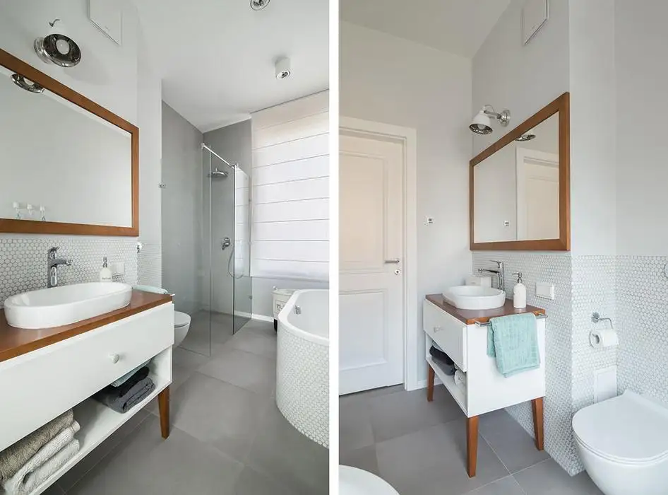 Baia este in acelasi timp si un spatiu destinat spalatoriei. Masina de spalat si uscatorul sunt ingenios ascunse in perete prin montarea unui dulap care imita perfect textura si cromatica acestuia.