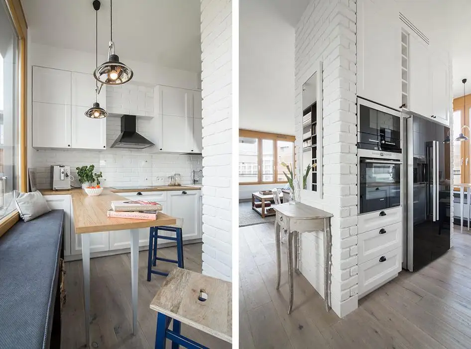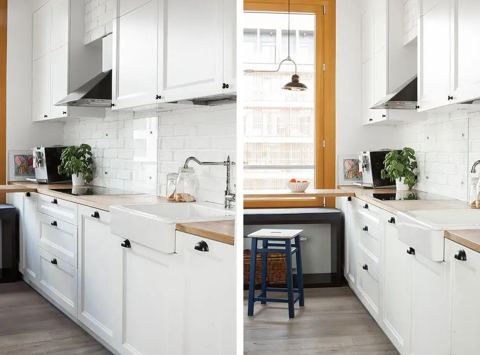 In ciuda dimensiunilor reduse, bucataria isi dovedeste functionalitatea si este un adevarat produs al creativitatii extensia blatului de lucru il face potrivit pentru zona de luat masa si se completeaza cu banca montata pe cadrul pervazului. Decorul alb este accentuat prin blaturile din lemn in nuante mai inchise.