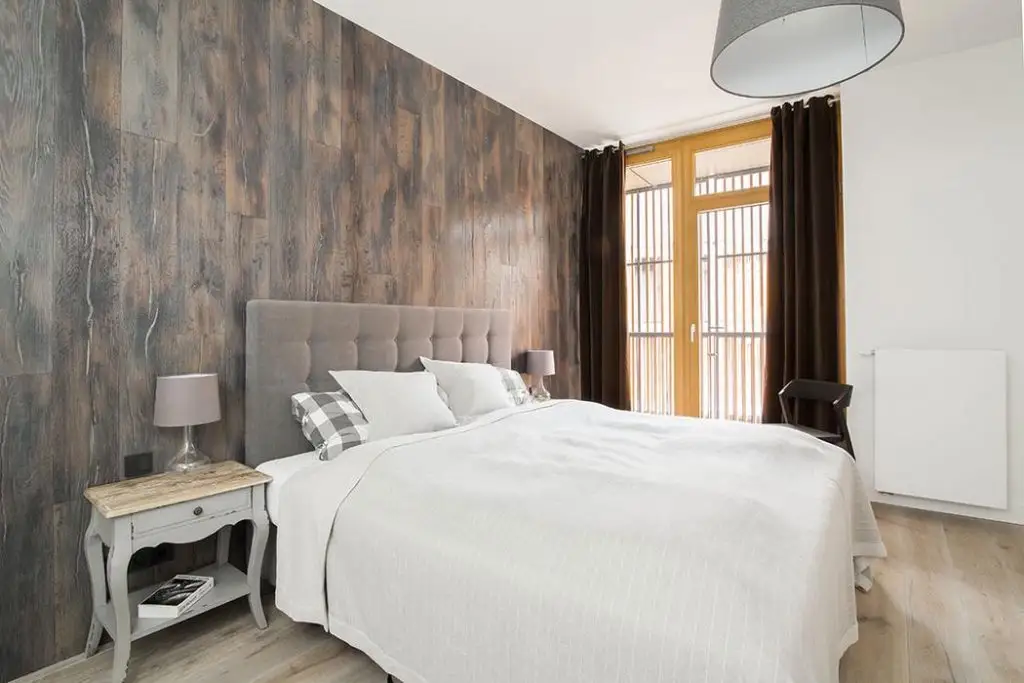 Dormitorul principal al apartamentului emana o senzatie de caldura in care lemnul este cu adevarat pus in valoare. Peretele accent din spatele patului a fost captusit cu lemn in nuante inchise, contrastante, noptierele au primit nuante mai deschise, iar ramele ferestrelor au fost fabricate din cea mai deschisa nuanta de lemn din incapere.