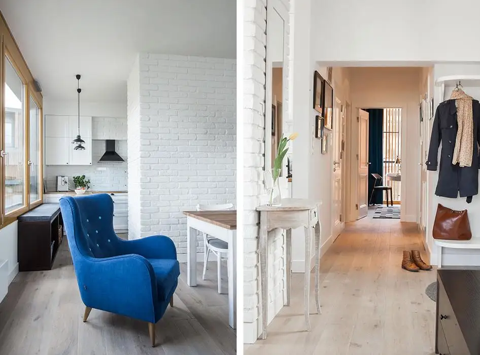 Albul imaculat al peretilor apartamentului, pe alocuri cu aspect de caramida falsa, se imbina cu podelele gri care respecta ambianta sobra a stilului scandinav. Livingul apartamentului primeste lumina naturala din abundenta datorita ferestrelor de mari dimensiuni.