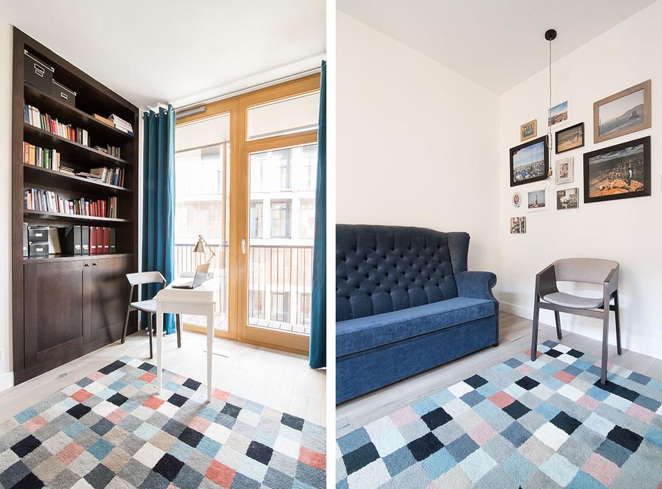 Coltul in care a fost amenajat spatiul de lucru este de asemenea invadat de lumina, aflandu-se in apropierea ferestrei. Biblioteca din lemn, covorul multicolor si draperiile turcoaz contribuie la atmosfera plina de inspiratie pe care o emana spatiul de lucru din cest apartament.