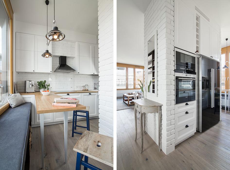 In ciuda dimensiunilor reduse, bucataria isi dovedeste functionalitatea si este un adevarat produs al creativitatii extensia blatului de lucru il face potrivit pentru zona de luat masa si se completeaza cu banca montata pe cadrul pervazului. Decorul alb este accentuat prin blaturile din lemn in nuante mai inchise.