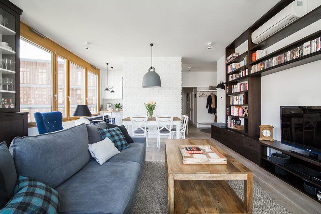Albul imaculat al peretilor apartamentului, pe alocuri cu aspect de caramida falsa, se imbina cu podelele gri care respecta ambianta sobra a stilului scandinav. Livingul apartamentului primeste lumina naturala din abundenta datorita ferestrelor de mari dimensiuni.