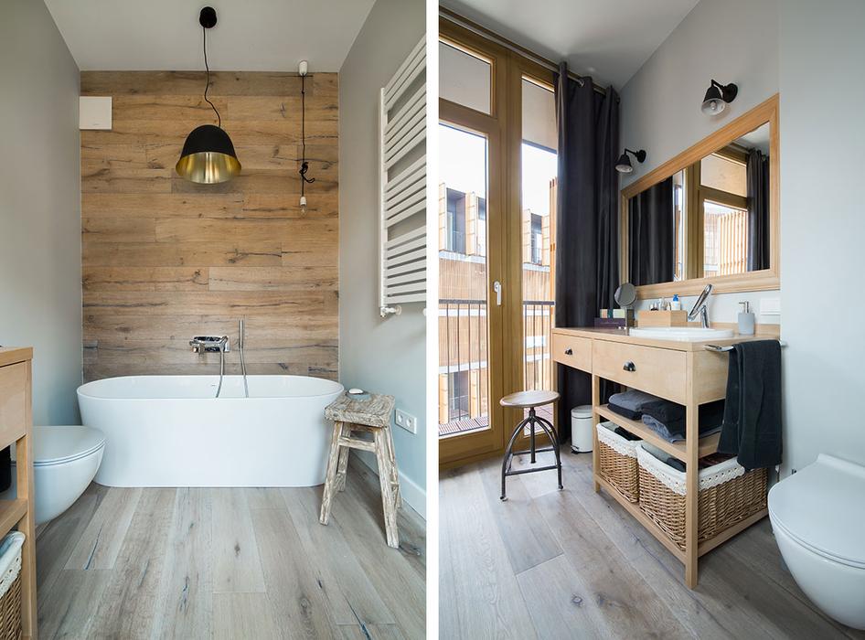 Baia este in acelasi timp si un spatiu destinat spalatoriei. Masina de spalat si uscatorul sunt ingenios ascunse in perete prin montarea unui dulap care imita perfect textura si cromatica acestuia.
