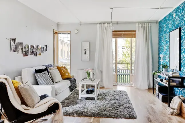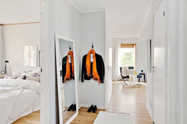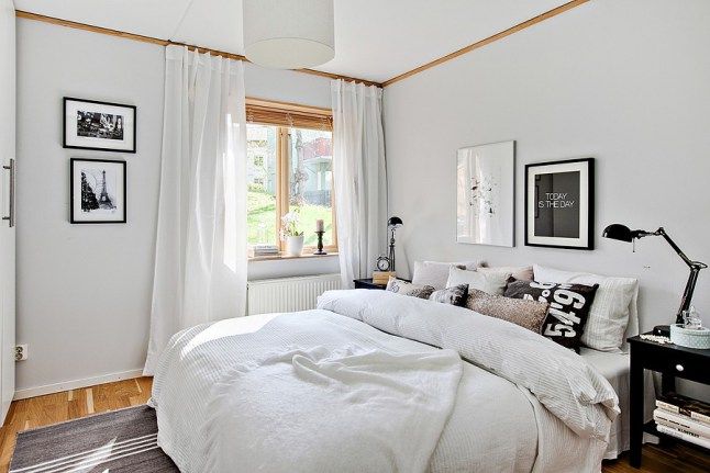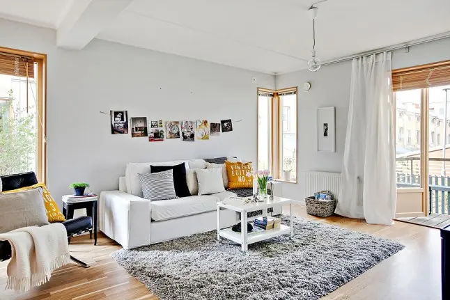 Ne place simplitatea acestei amenajari, fiecare element ilustrand o parte din personalitatea celui care locuieste aici. Micile pete de culoare, mov, galben, albastru, texturile pufoase ale covorului, pernelor decorative si ale paturicilor ne transmit o stare de bine si de confort.