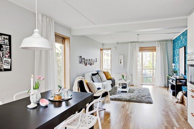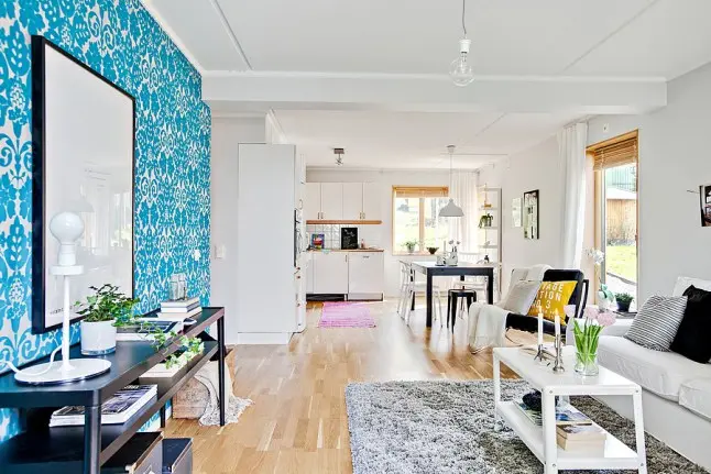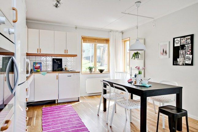 Albul predominant amplifica si el spatiul oferind cadrul perfect pentru a introduce piese si detalii colorate cum ar fi masa neagra din zona de dining, covorasul mov din bucatarie, scaunul Barcelona din living sau peretele cu tapet albastru din living.