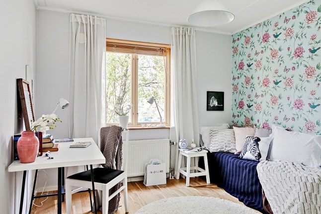 Frumos conturata este camera destinata biroului, cu un tapet cu motiv floral si piese decorative care imbogatesc textural si vizual incaperea.