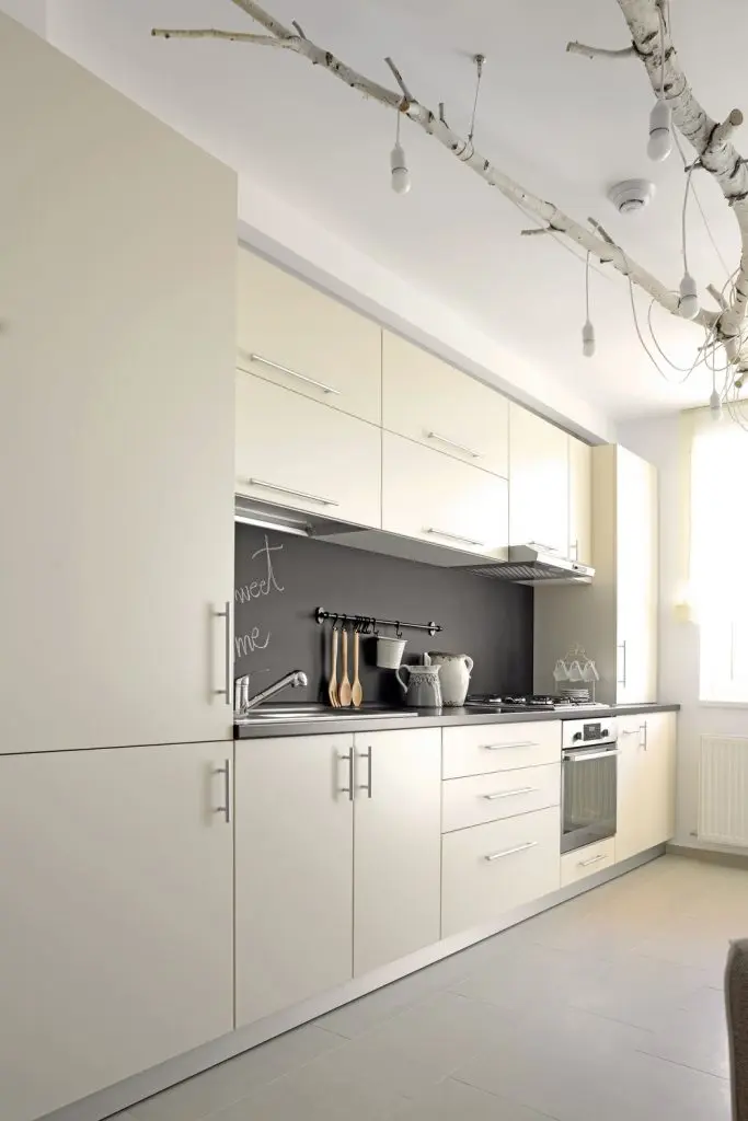 Cremul bucatariei este o alegere perfecta pentru aceasta bucatarie compacta, sustinand luminozitatea incaperii.