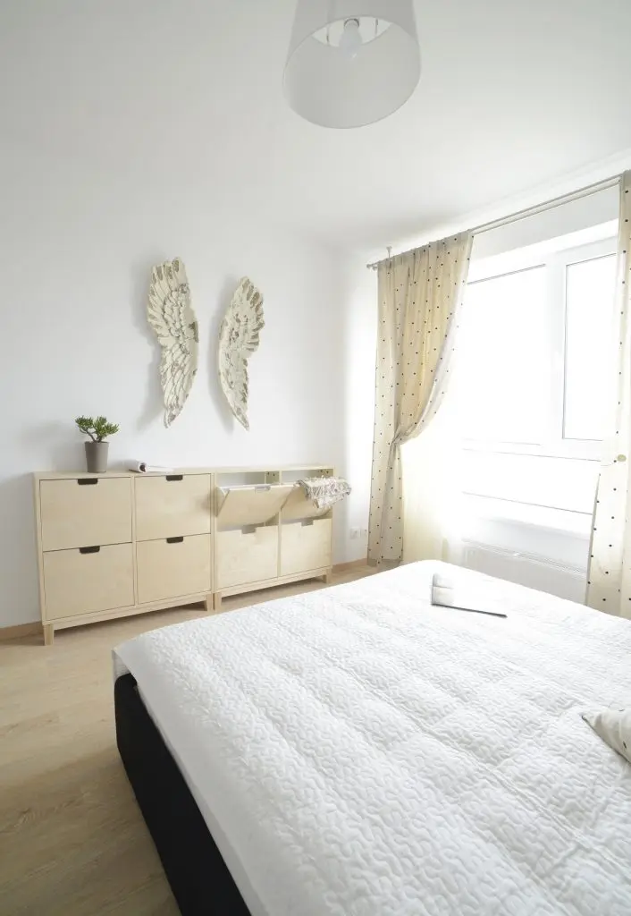 Pentru dormitor s-a dorit o depozitare joasa, placuta care sa nu agreseze spatiul prin inaltimea dulapurilor, dar indeajuns pentru doua persoane. Astfel, s-a optat pentru piese de mobilier mic de la Ikea, pat Lineaflex cu tablie personalizata Thecraftlab by Irina Neacsu (prin cele doua perne Signora si Signore) si aripi de inger de la Kare pentru un efect dramatic.