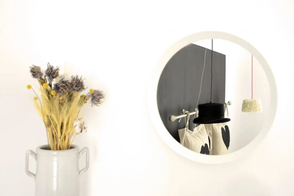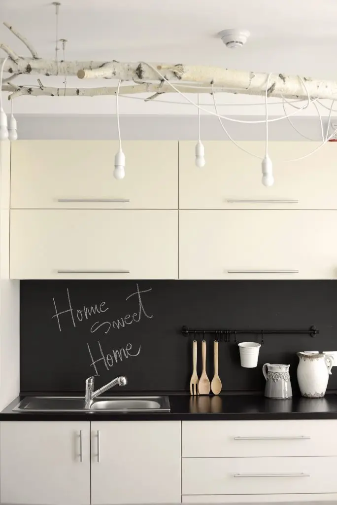 Lampa din creanga de mesteacan realizata de cei de la Alinart te cucereste prin neconventionalul ei. Ea sprijina tematica acestei amenajari a naturii inserate in spatiul de locuit. Nu putem sa ignoram nici frontul din vopsea de tabla scolara pe care se pot scrie mesaje cu creta.