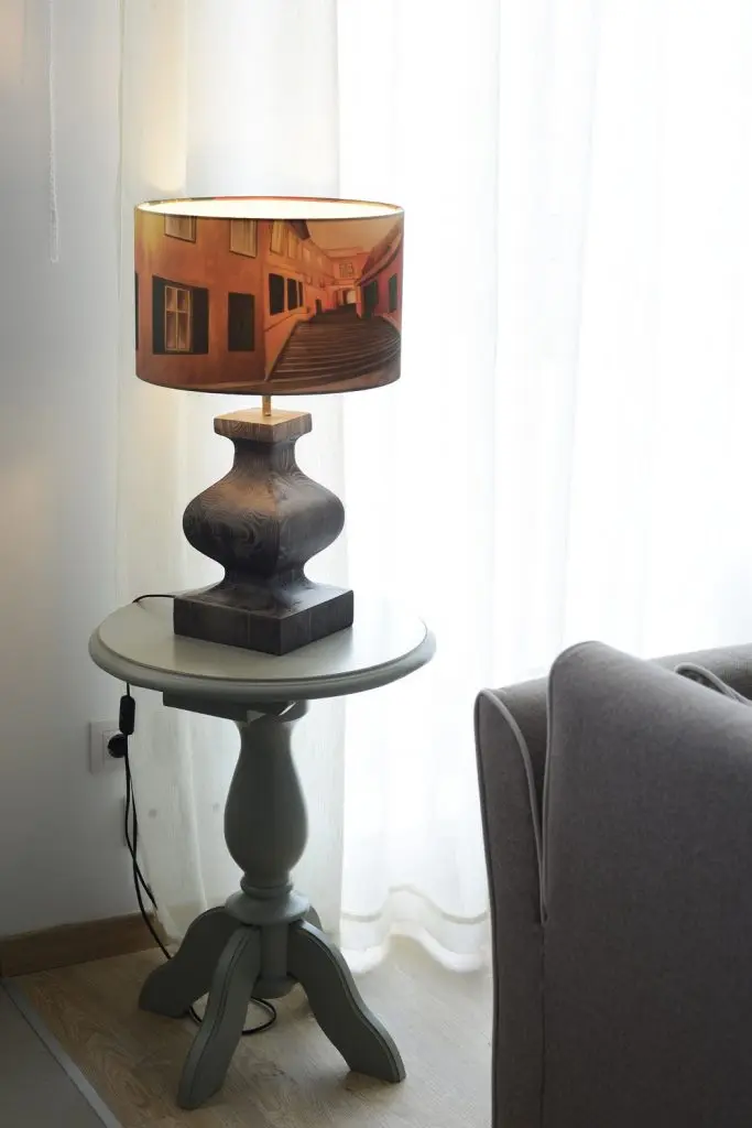 Lampa care poarta semnatura thecraftlab by Irina Neacsu; abajur realizat din print