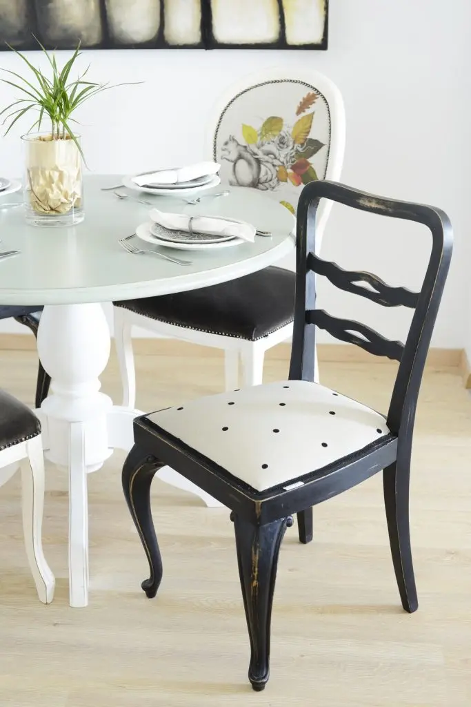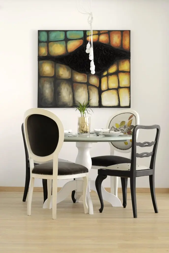 Diningul amplu este frumos pus in valoare prin masa de la Quadra, scaunele cu tapiterie realizata tot de Irina Neacsu si un tablou 3D si corpul de iluminat discret.
