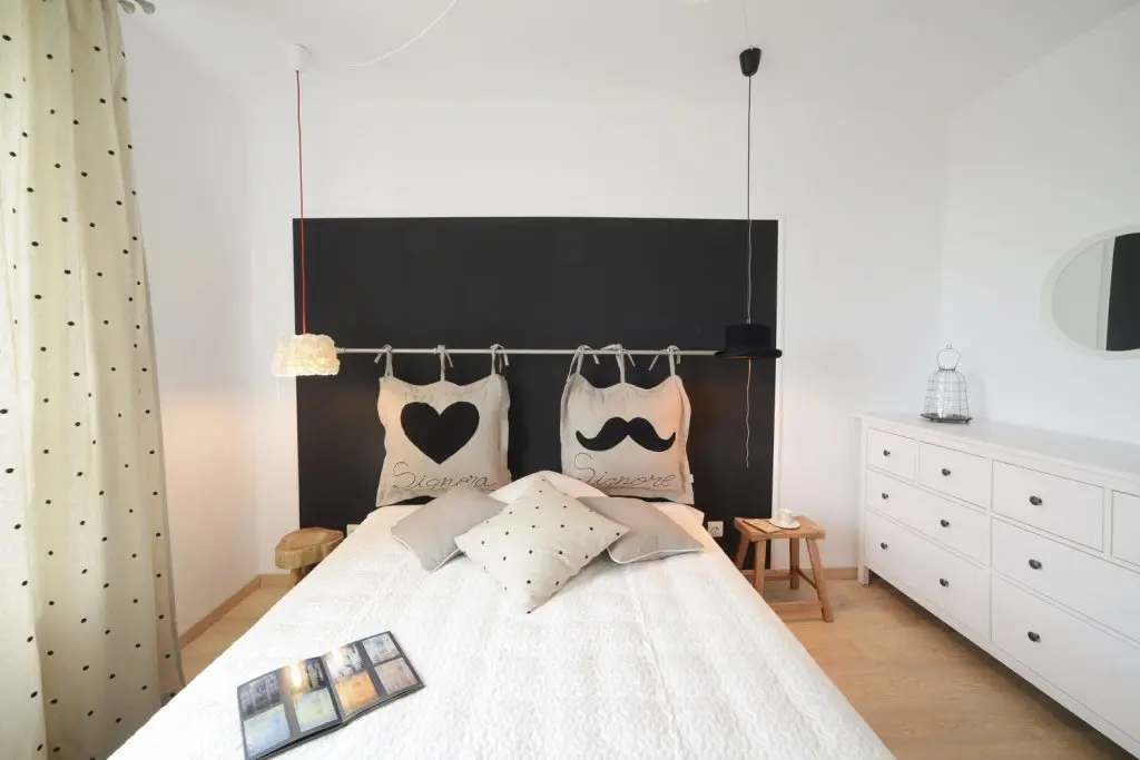 Tablia patului este personalizata prin cele doua perne numite simbolic Signora si Signore.