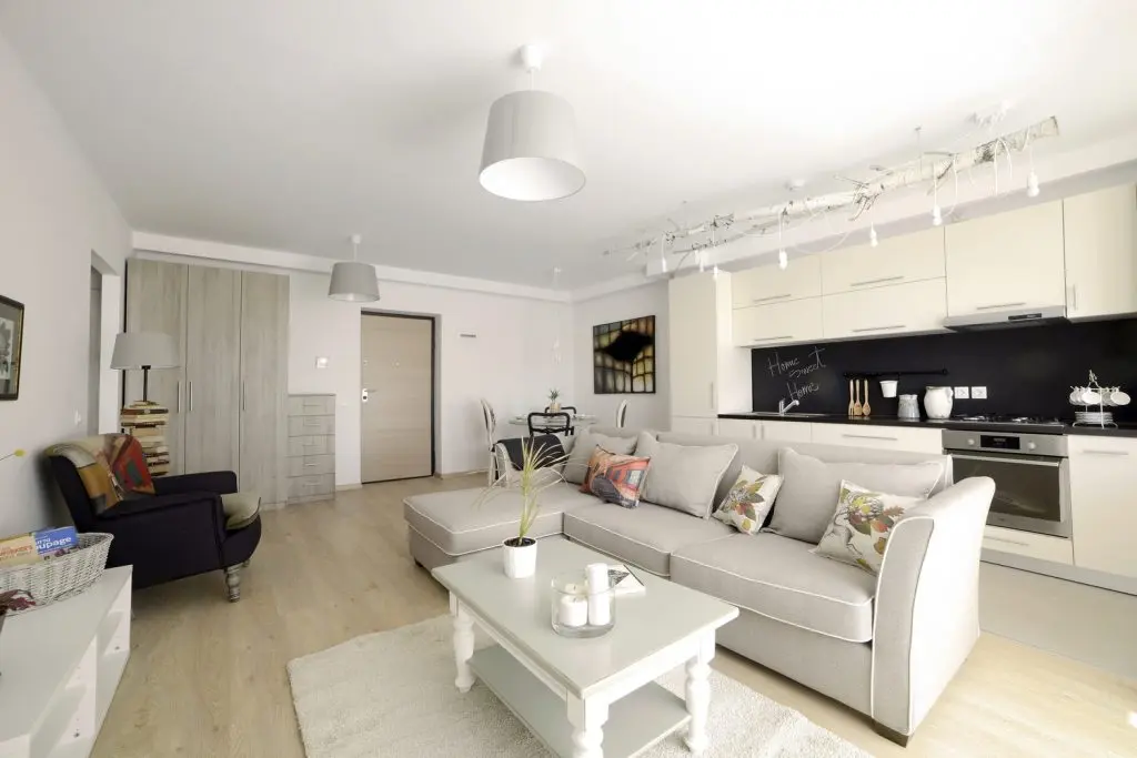 Fiind o locuinta tip open space, practic o singura camera reuneste zona de zi, incluzand livingul, bucataria si diningul. Vorbim despre un spatiu echilibrat cu multa lumina naturala si cu ferestre ample, dar compact prin prisma functiunilor integrate.
