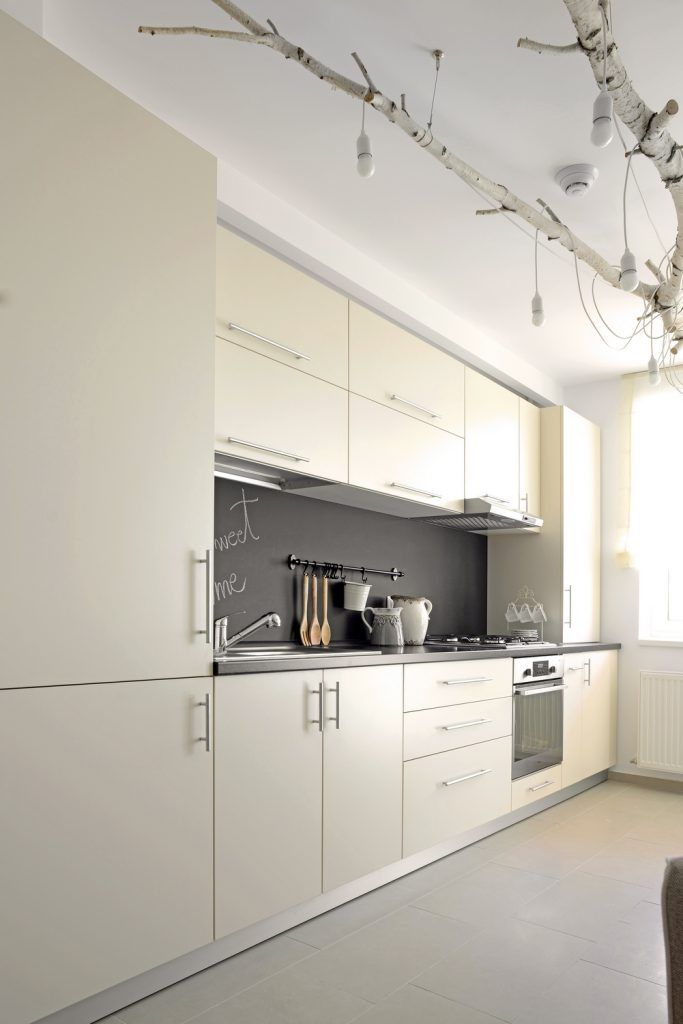 Lampa din creanga de mesteacan realizata de cei de la Alinart te cucereste prin neconventionalul ei. Ea sprijina tematica acestei amenajari a naturii inserate in spatiul de locuit. Nu putem sa ignoram nici frontul din vopsea de tabla scolara pe care se pot scrie mesaje cu creta.