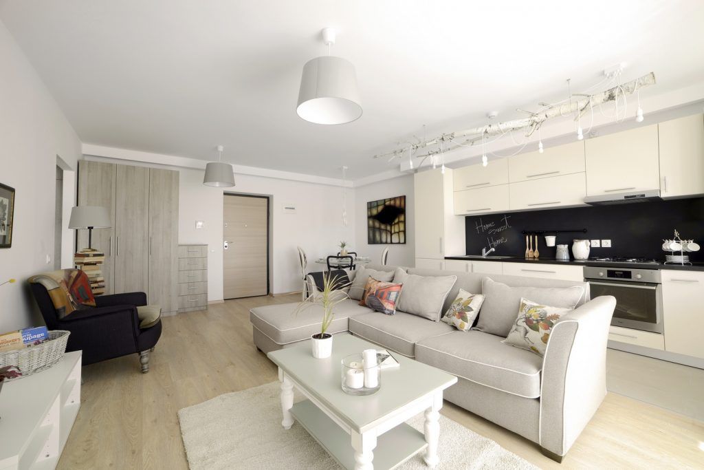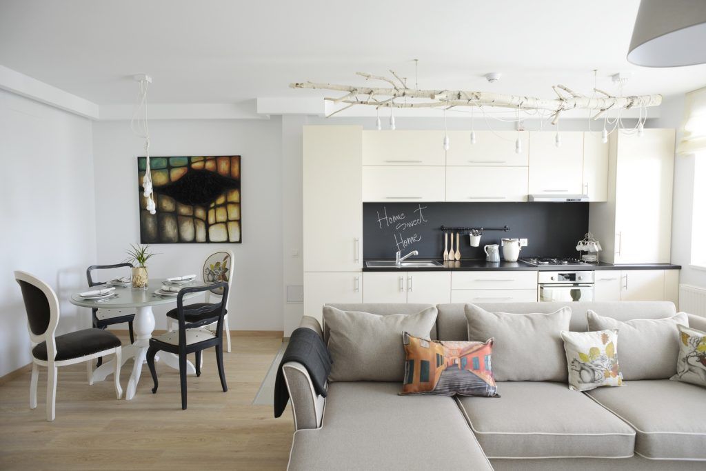 Fiind o locuinta tip open space, practic o singura camera reuneste zona de zi, incluzand livingul,bucatariasi diningul. Vorbim despre un spatiu echilibrat cu multa lumina naturala si cu ferestre ample, dar compact prin prisma functiunilor integrate. De altfel, structura livingului a fost gandita astfel incat piesele sa fie reorganizate in functie de preferinte.