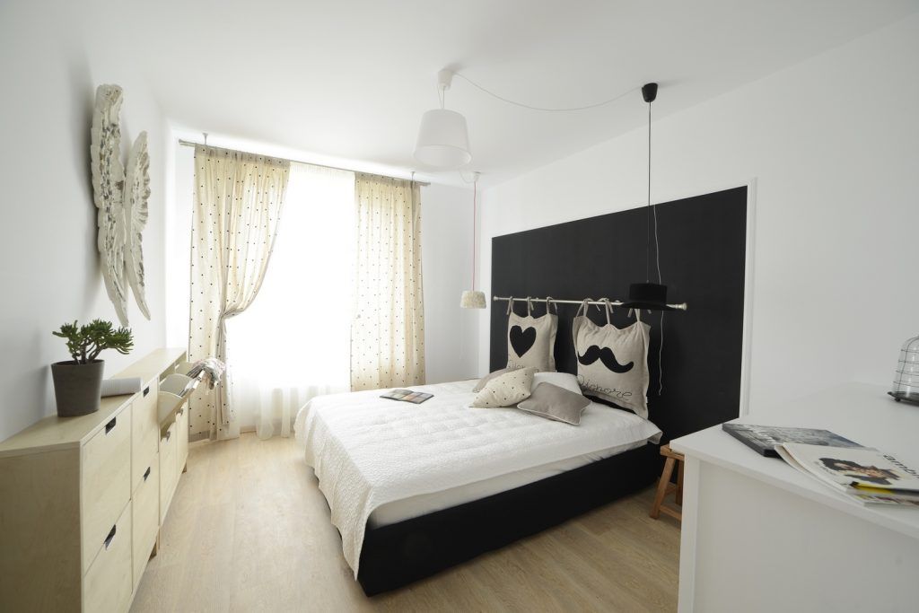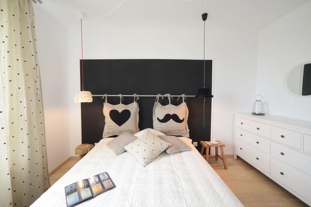 Pentru dormitor s-a dorit o depozitare joasa, placuta care sa nu agreseze spatiul prin inaltimea dulapurilor, dar indeajuns pentru doua persoane. Astfel, s-a optat pentru piese de mobilier mic de la Ikea, pat Lineaflex cu tablie personalizata Thecraftlab by Irina Neacsu (prin cele doua perne Signora si Signore) si aripi de inger de la Kare pentru un efect dramatic.